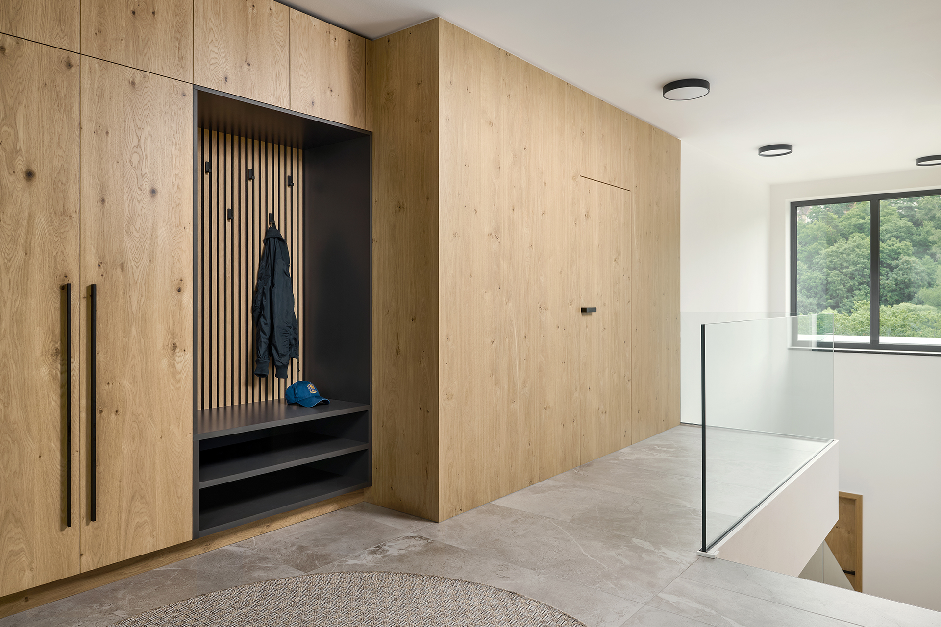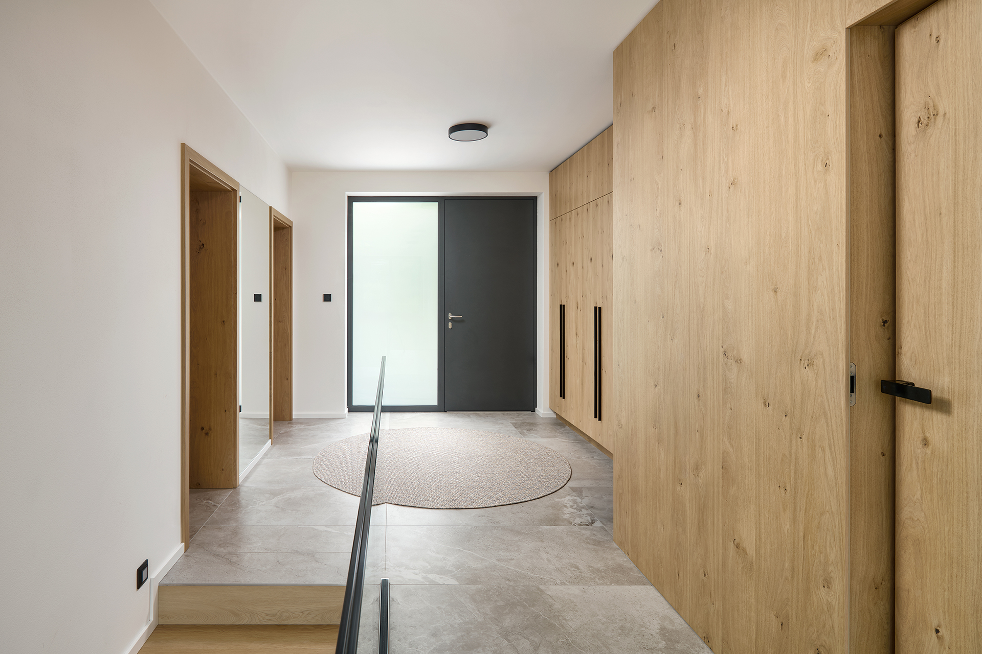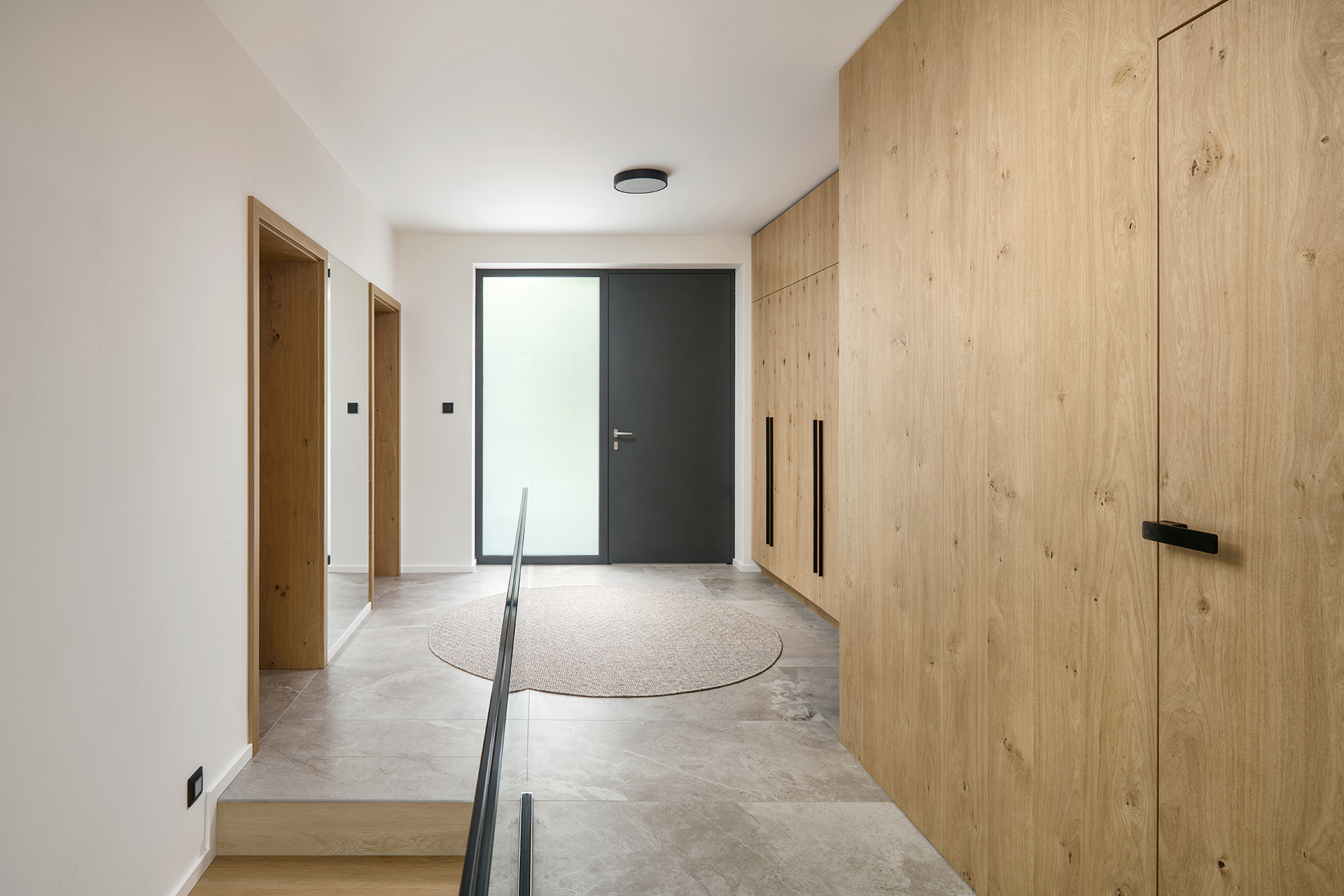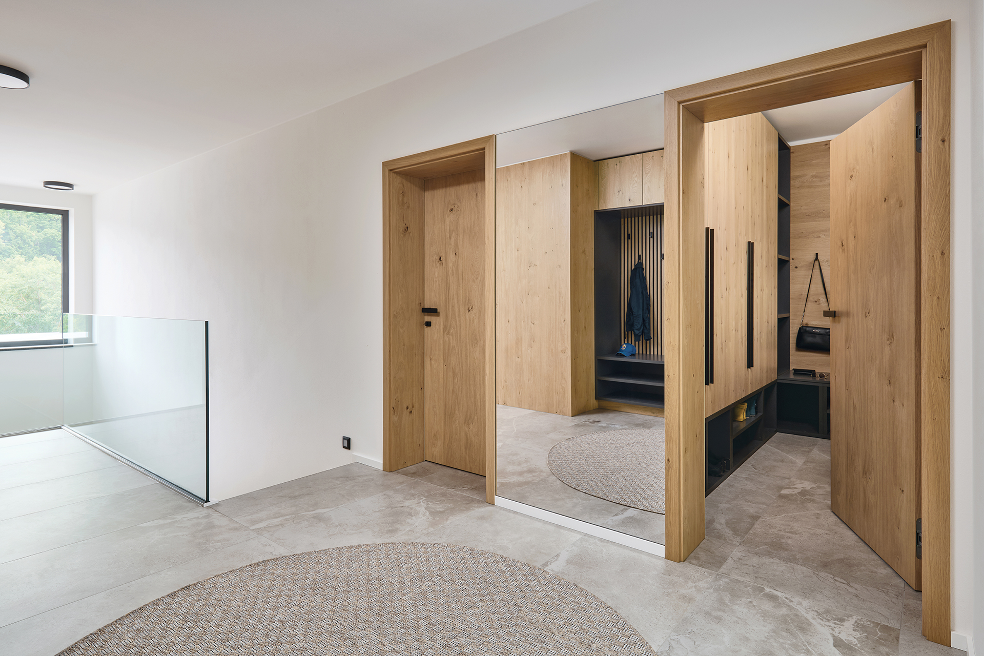 Vestavěné skříně LINE/OPTIMA přinášejí do předsíně i šatny pořádek a zároveň esteticky doplňují celkový vzhled domu. Dokonalé zakončení prostoru tvoří dveře SPACE v přírodním dekoru, které sjednocují jednotlivé místnosti a podtrhují styl celého interiéru.