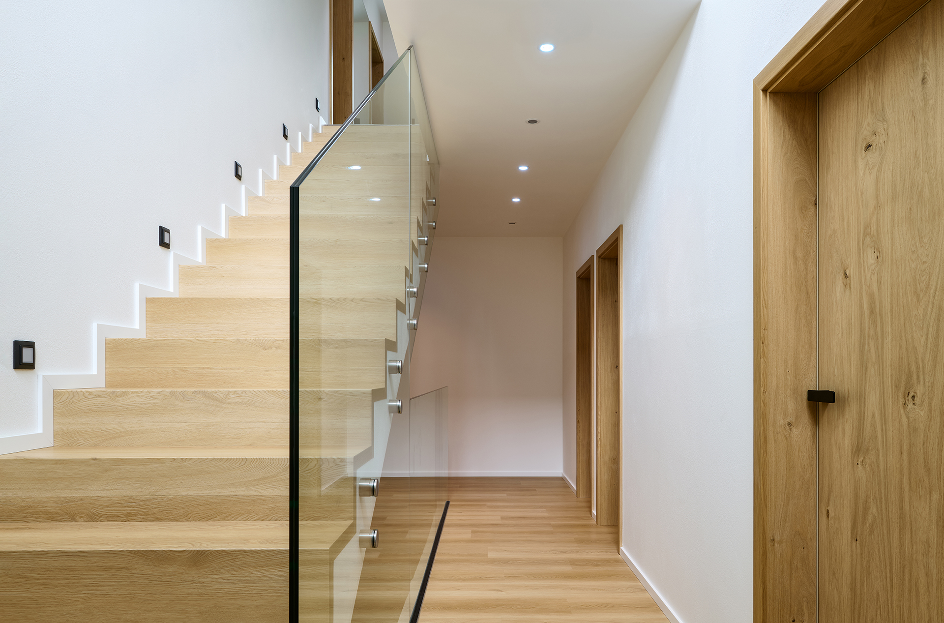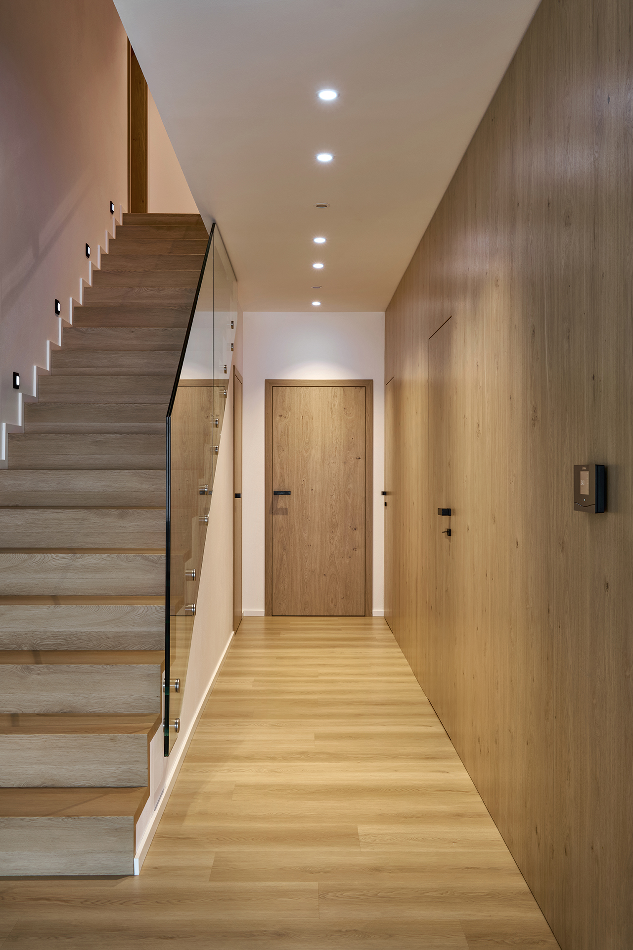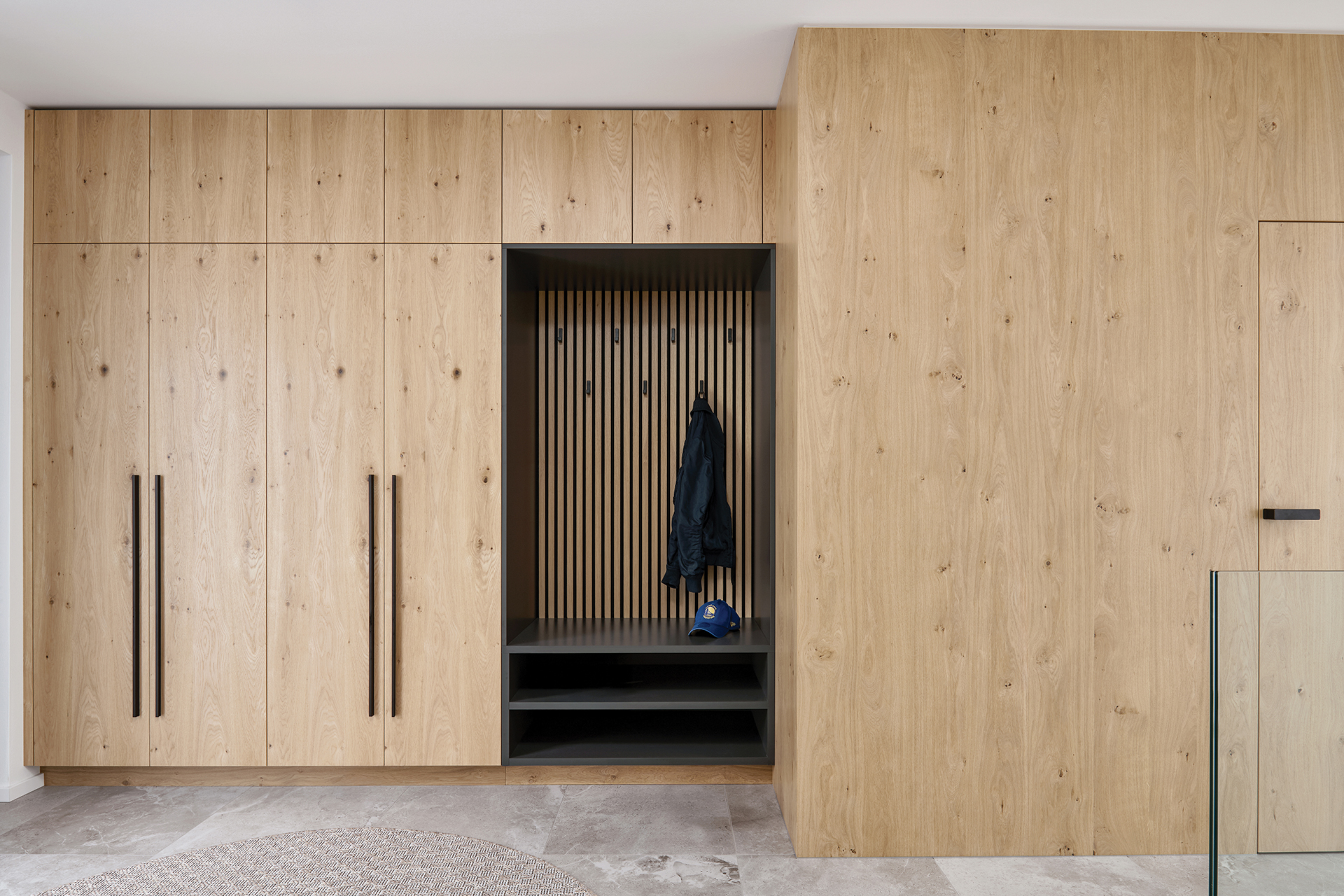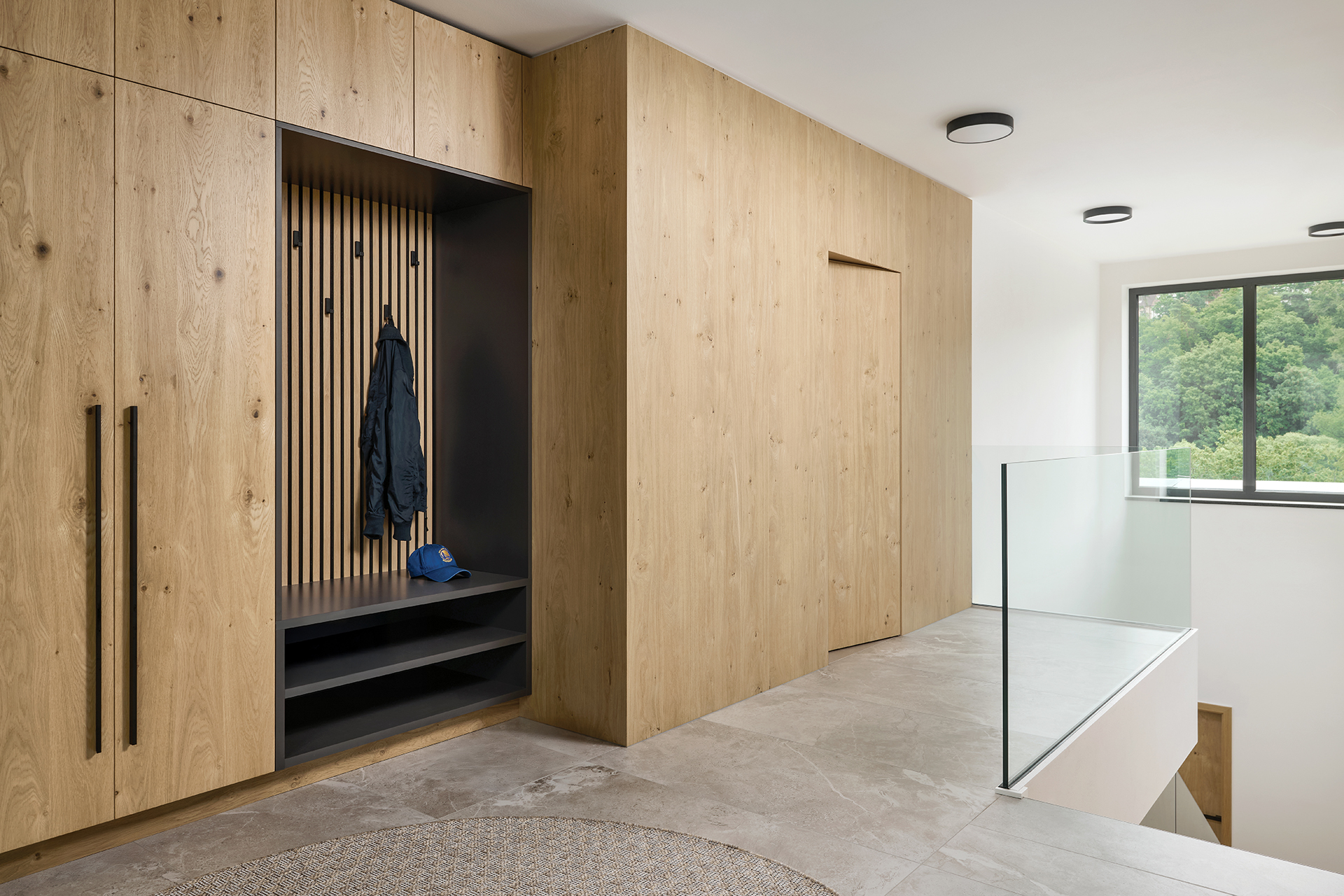 Vestavěné skříně LINE/OPTIMA přinášejí do předsíně i šatny pořádek a zároveň esteticky doplňují celkový vzhled domu. Dokonalé zakončení prostoru tvoří dveře SPACE v přírodním dekoru, které sjednocují jednotlivé místnosti a podtrhují styl celého interiéru.
