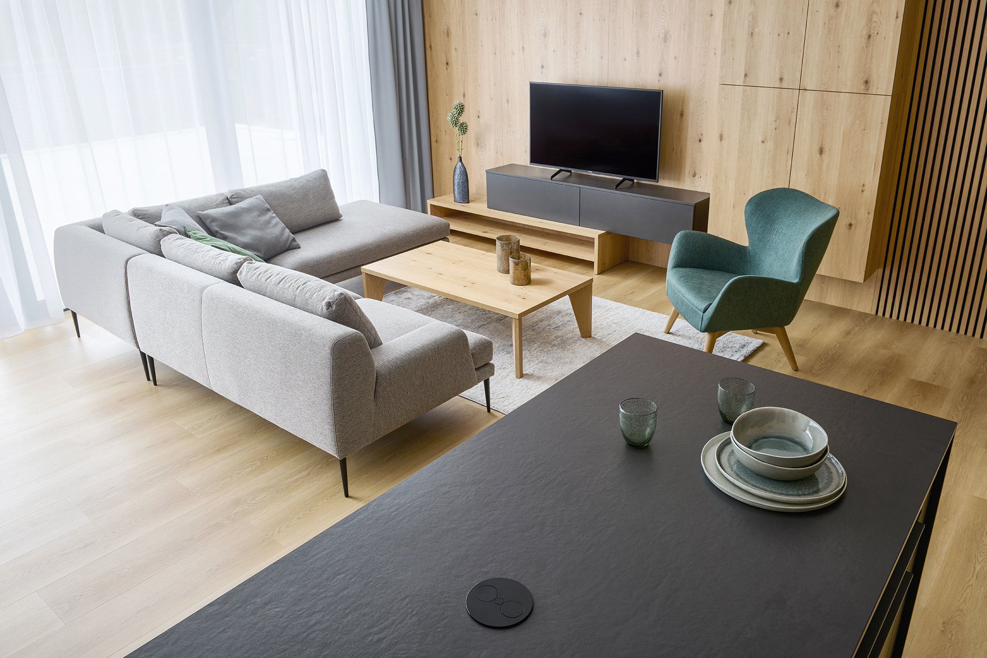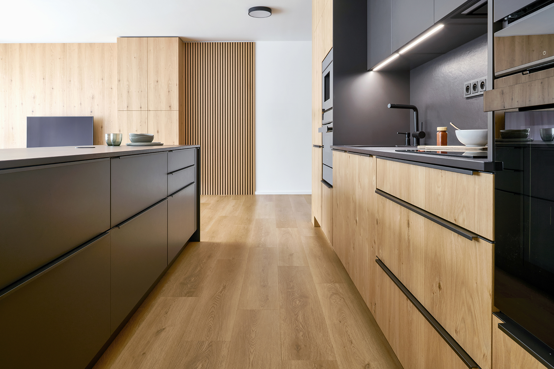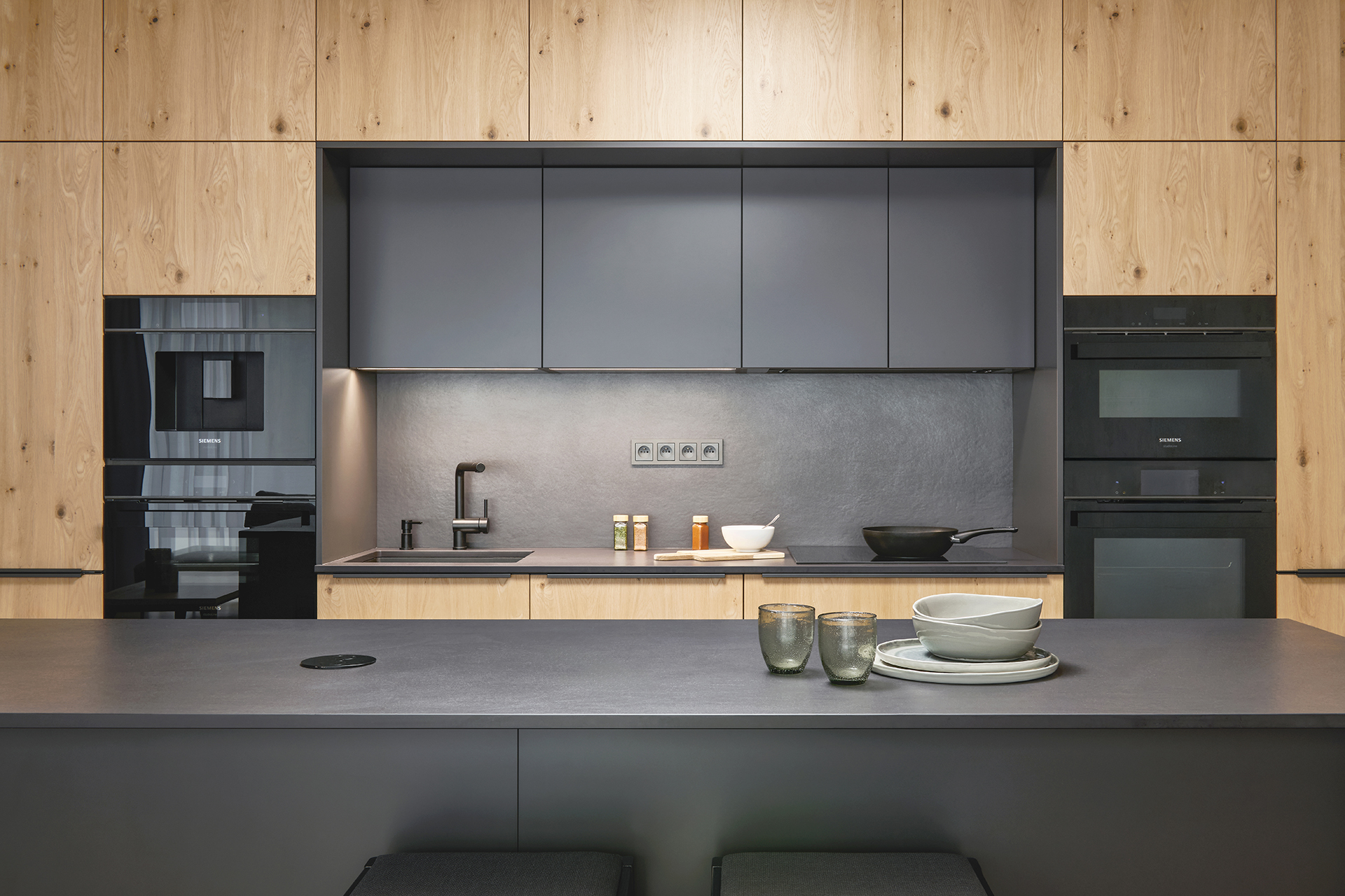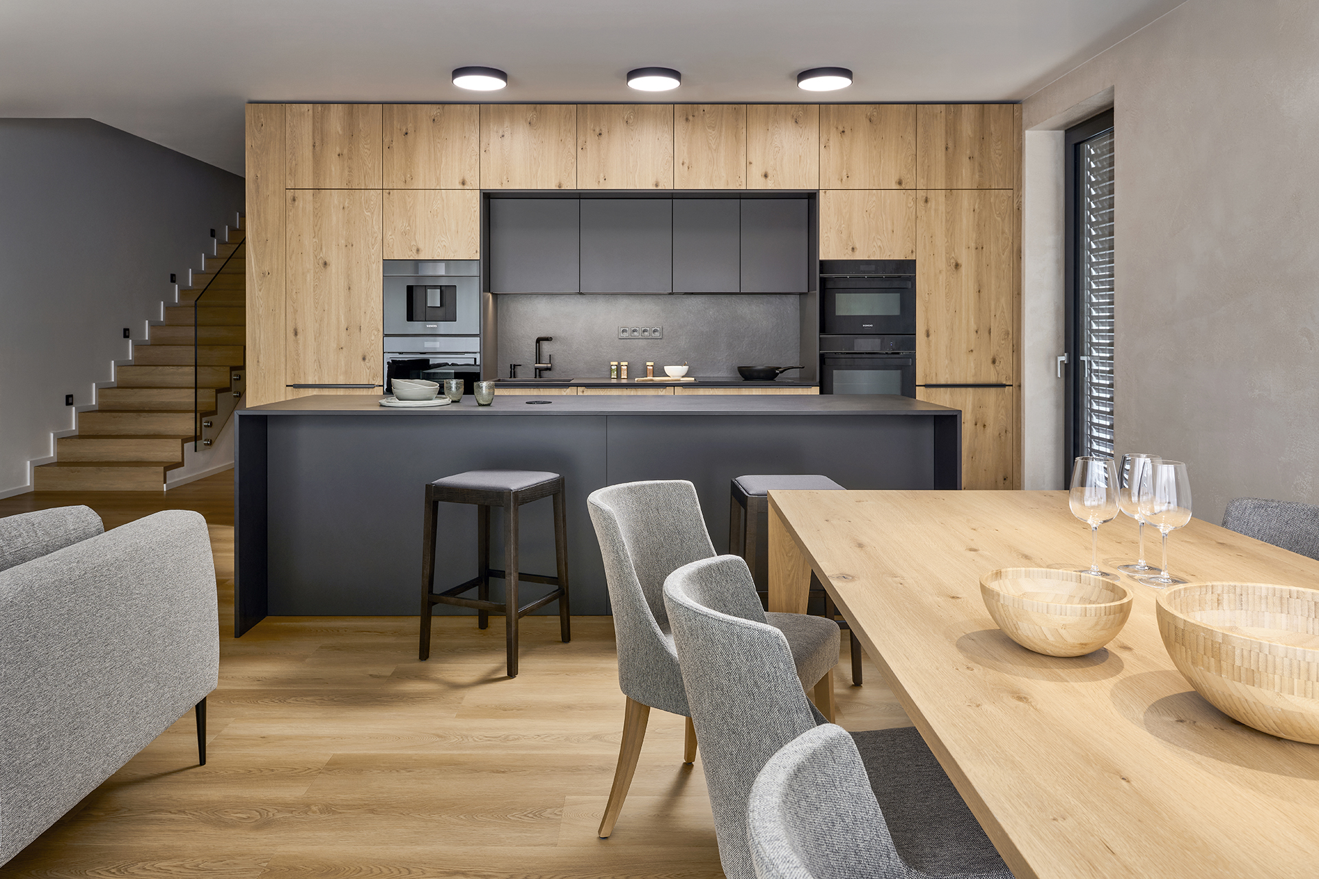 Kuchyně COMFORT/LINE v provedení Titan mat a dýhy Dub rustikal se stává skutečným středobodem interiéru. Přírodní dřevo vnáší do prostoru hřejivost a pocit klidu, zatímco čisté linie dodávají místnosti lehkost. Masivní pracovní deska Dekton Sirius je nejen praktická, ale zároveň výrazně kontrastní. Špičkové spotřebiče Siemens studioLine tuto zónu obohacují o chytré technologie, díky nimž se každodenní vaření mění v radostný zážitek.