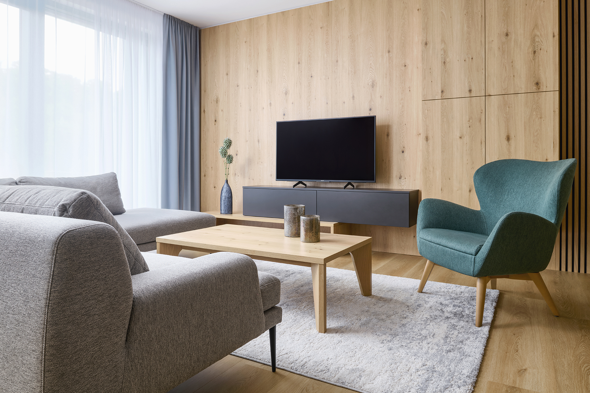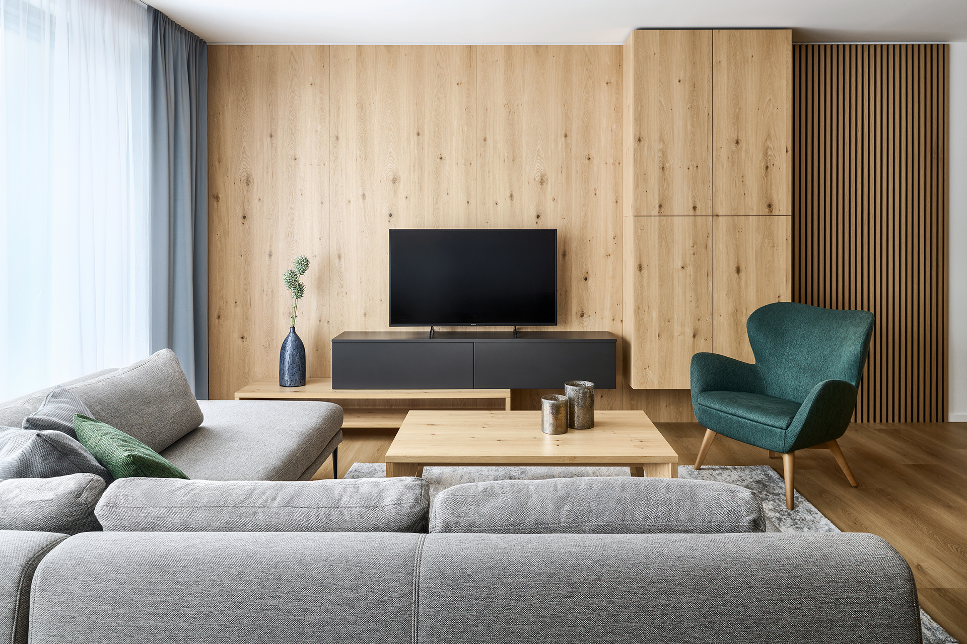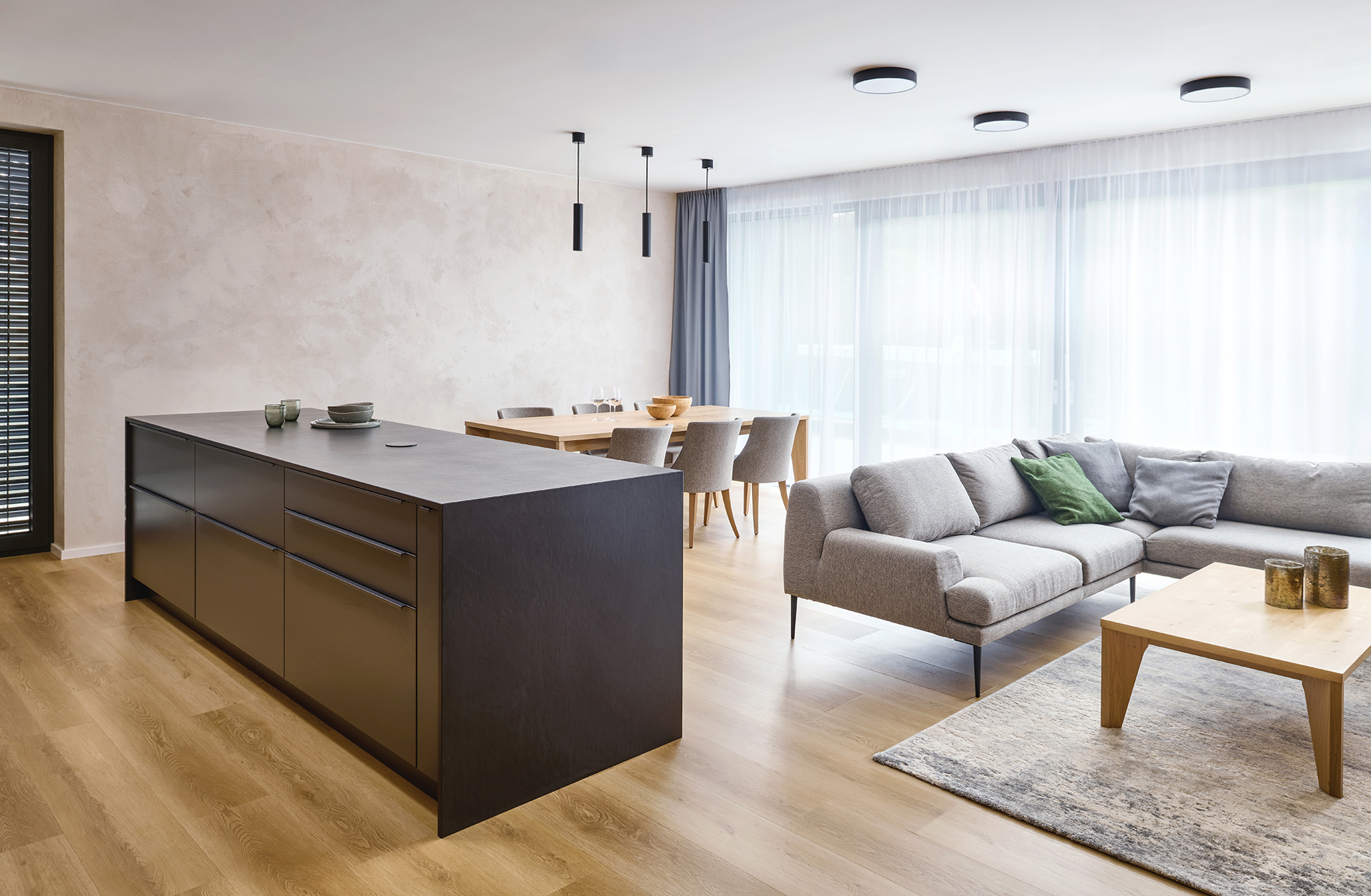 Kuchyně COMFORT/LINE v provedení Titan mat a dýhy Dub rustikal se stává skutečným středobodem interiéru. Přírodní dřevo vnáší do prostoru hřejivost a pocit klidu, zatímco čisté linie dodávají místnosti lehkost. Masivní pracovní deska Dekton Sirius je nejen praktická, ale zároveň výrazně kontrastní. Špičkové spotřebiče Siemens studioLine tuto zónu obohacují o chytré technologie, díky nimž se každodenní vaření mění v radostný zážitek.