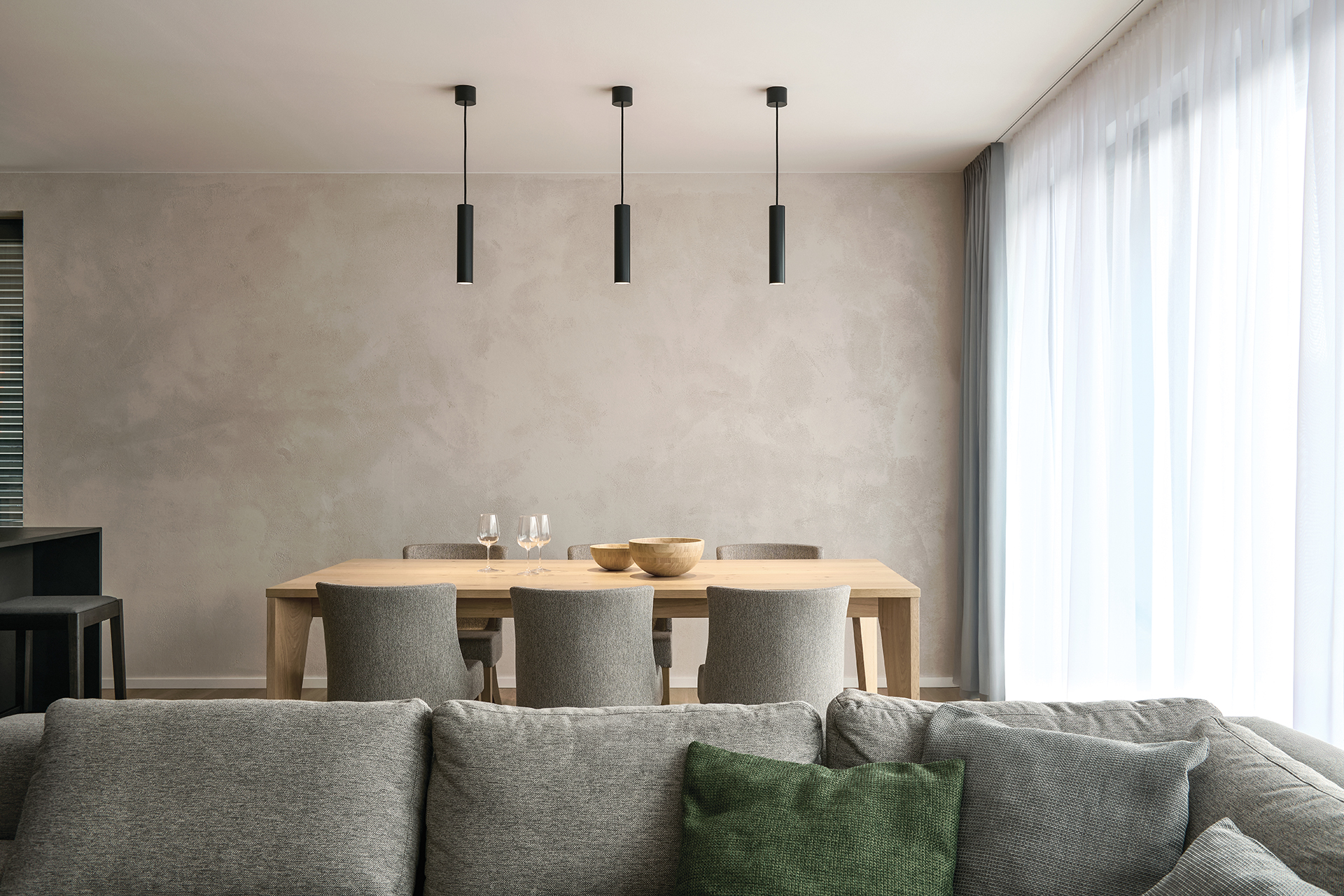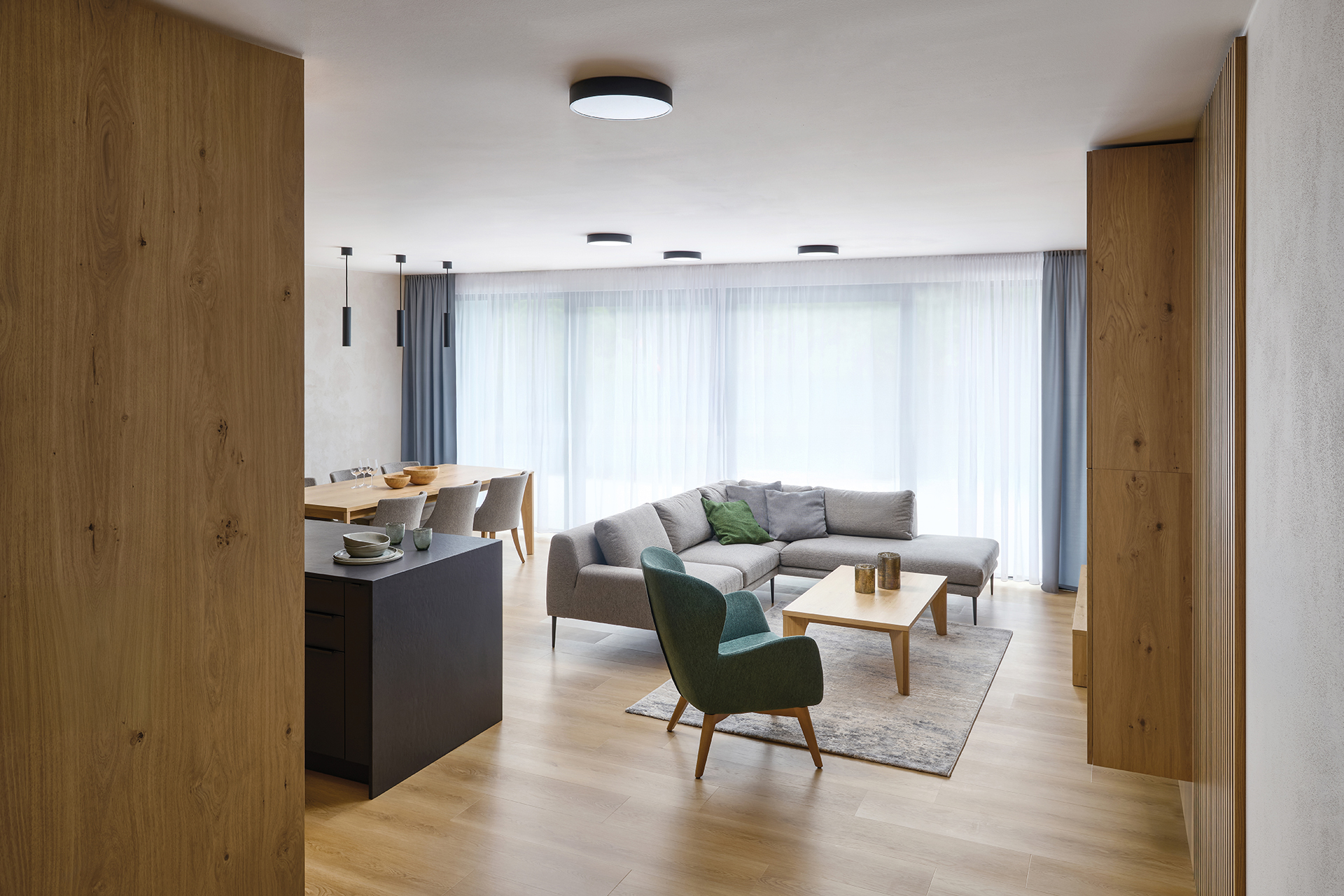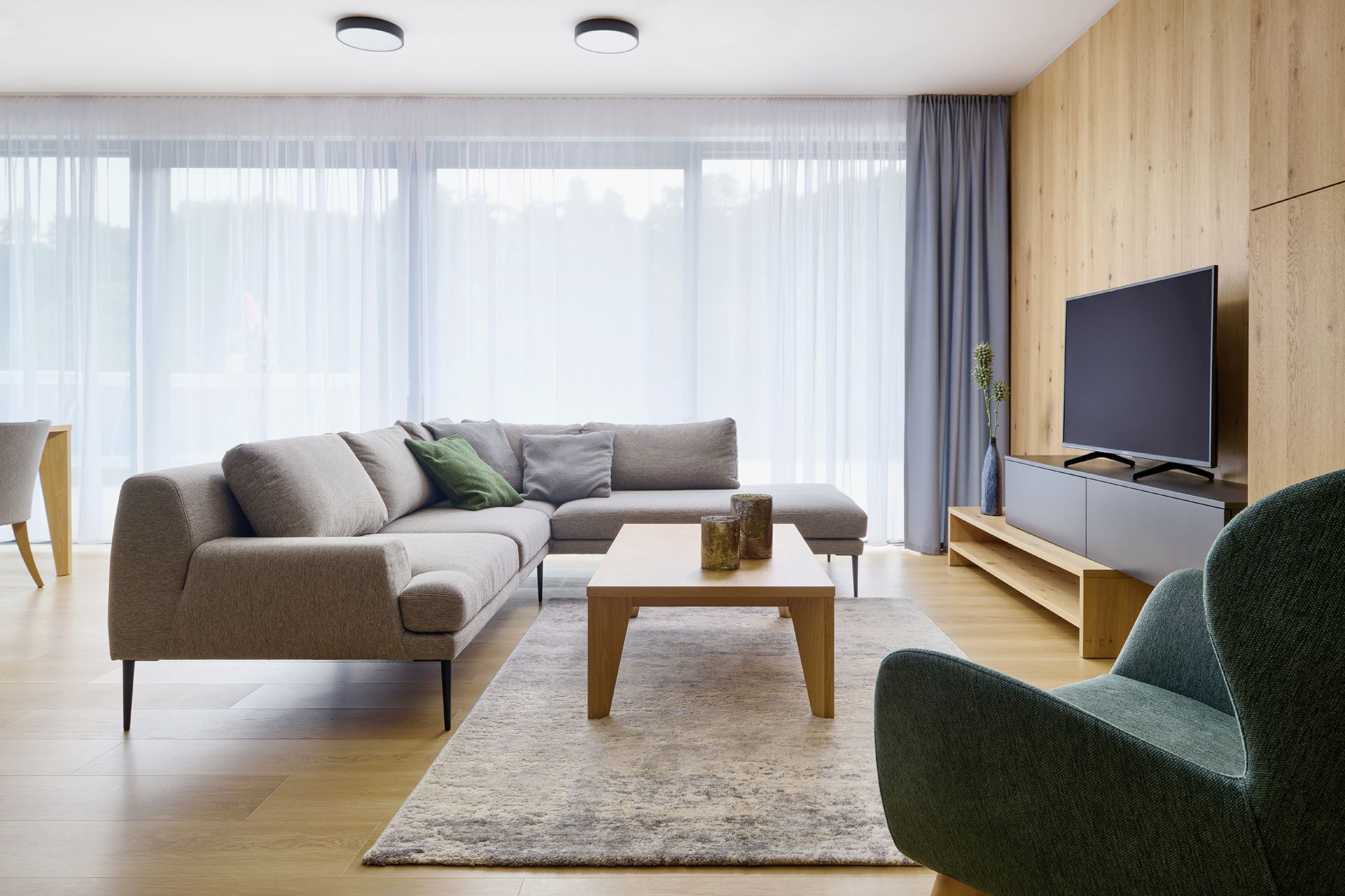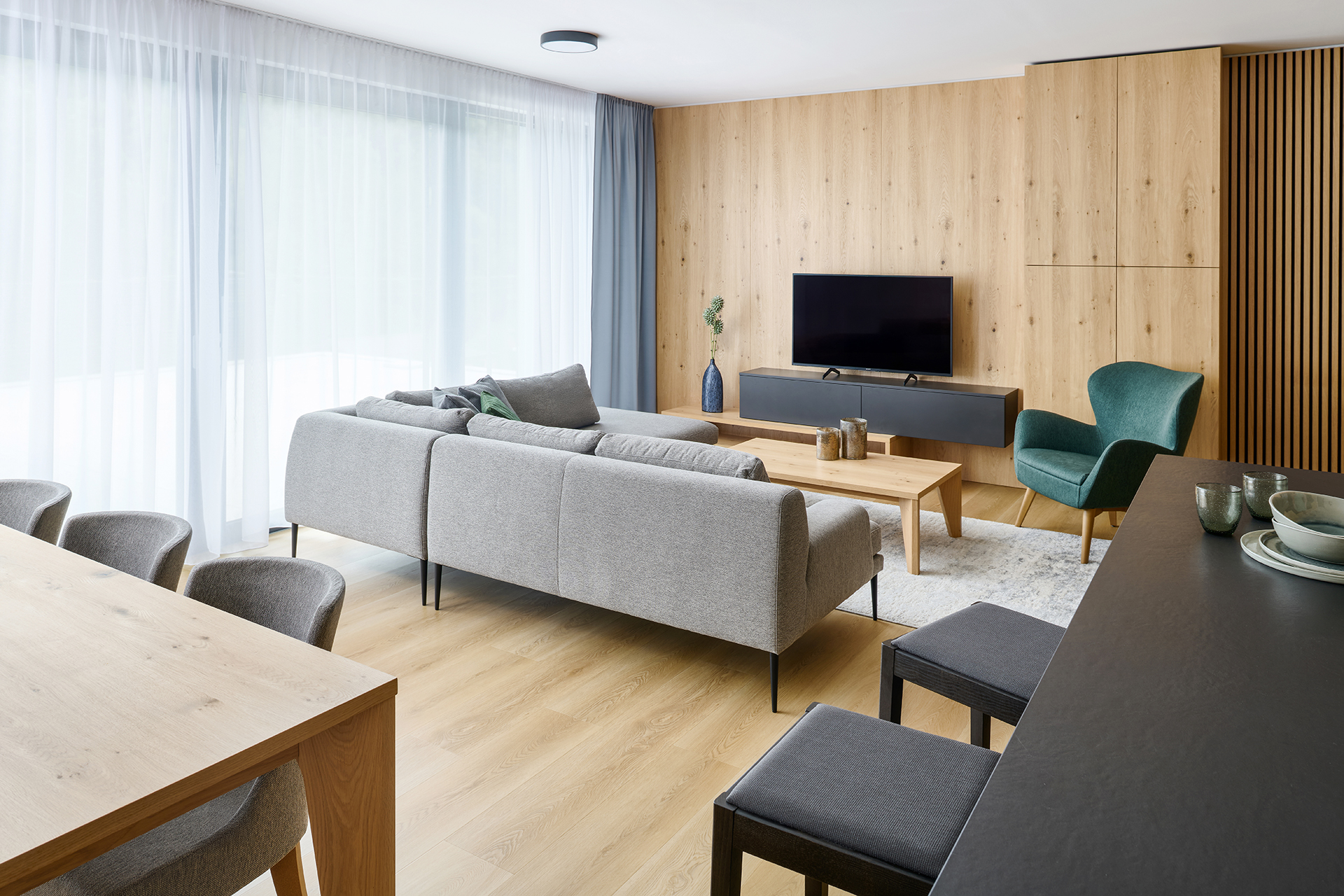 Kuchyně COMFORT/LINE v provedení Titan mat a dýhy Dub rustikal se stává skutečným středobodem interiéru. Přírodní dřevo vnáší do prostoru hřejivost a pocit klidu, zatímco čisté linie dodávají místnosti lehkost. Masivní pracovní deska Dekton Sirius je nejen praktická, ale zároveň výrazně kontrastní. Špičkové spotřebiče Siemens studioLine tuto zónu obohacují o chytré technologie, díky nimž se každodenní vaření mění v radostný zážitek.