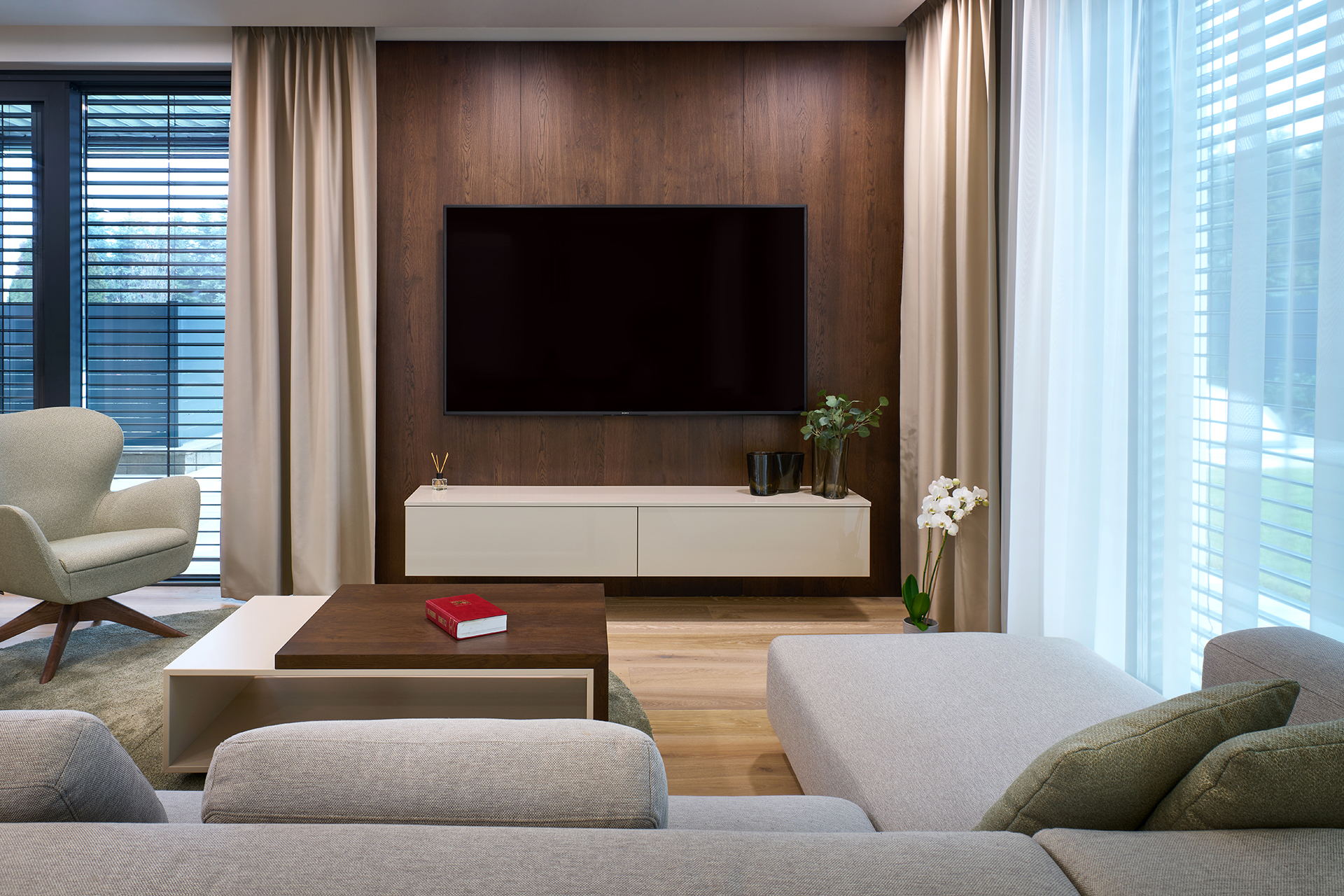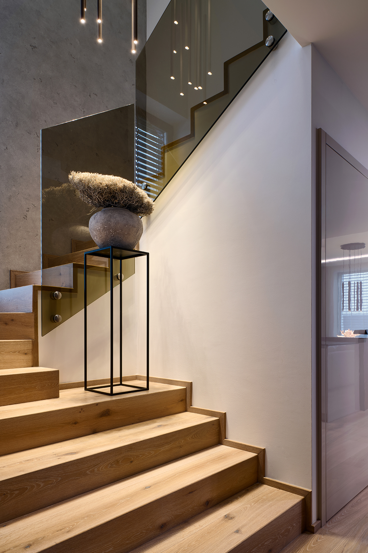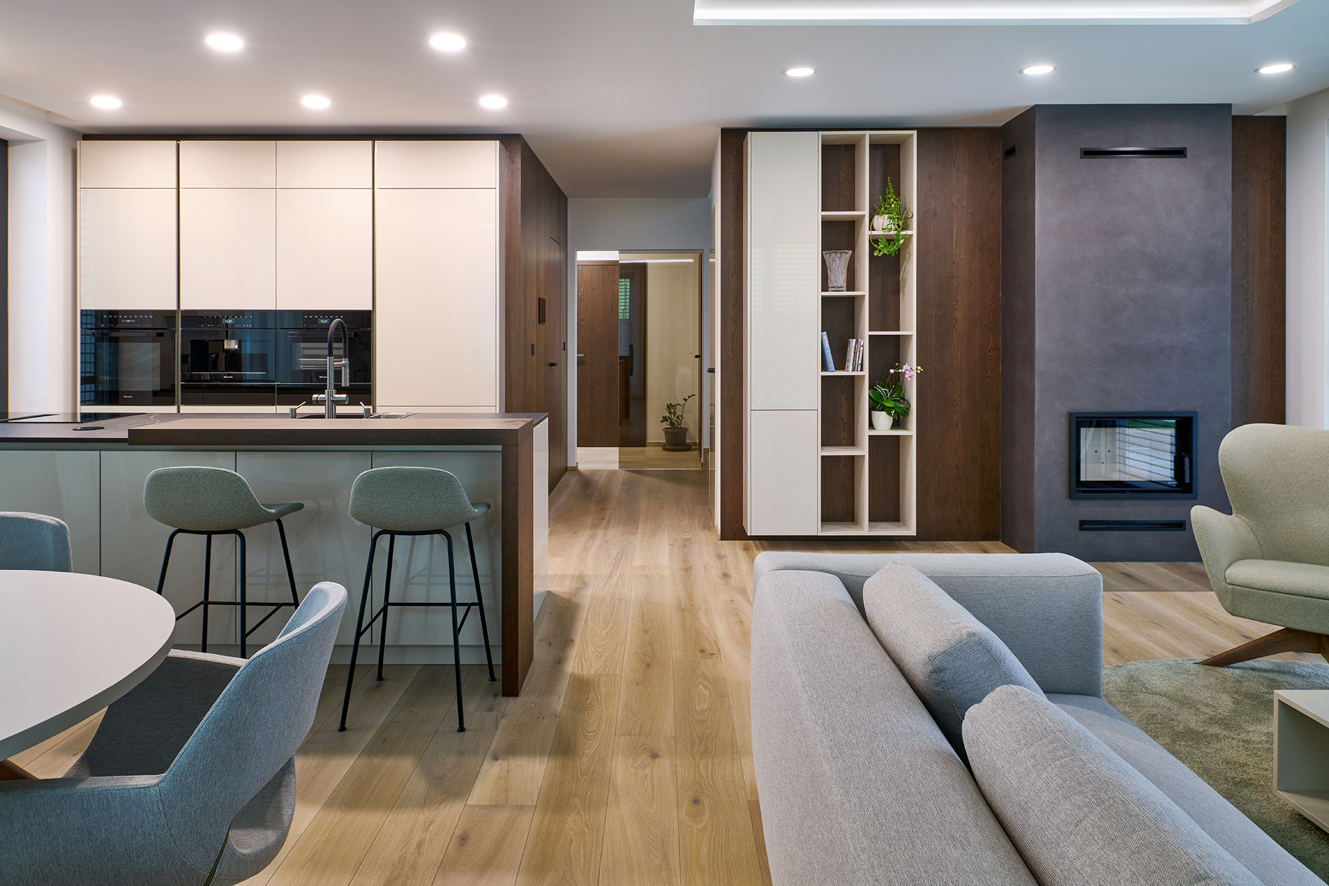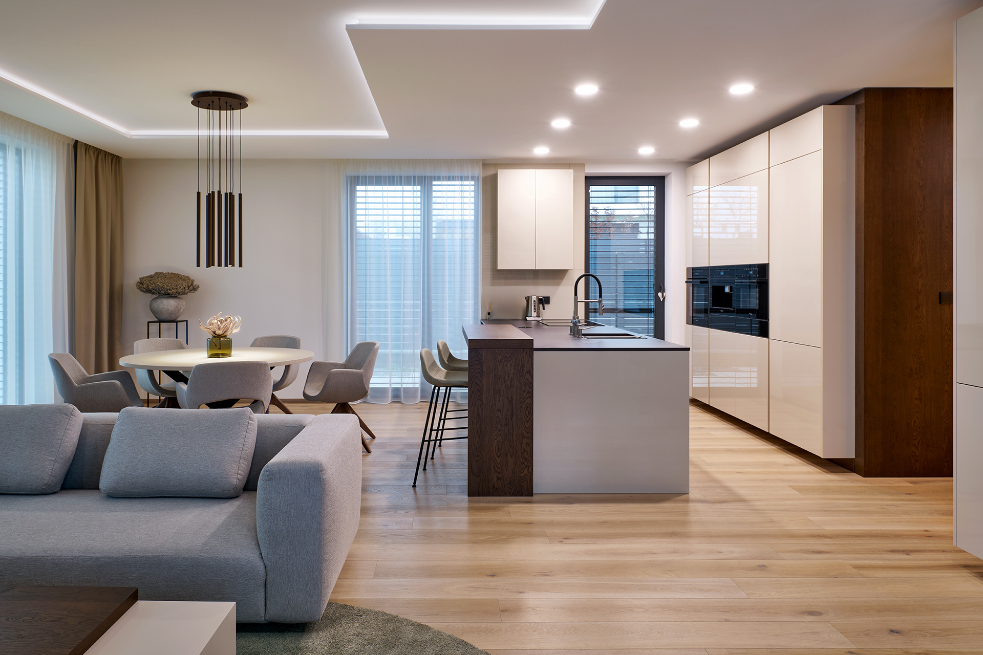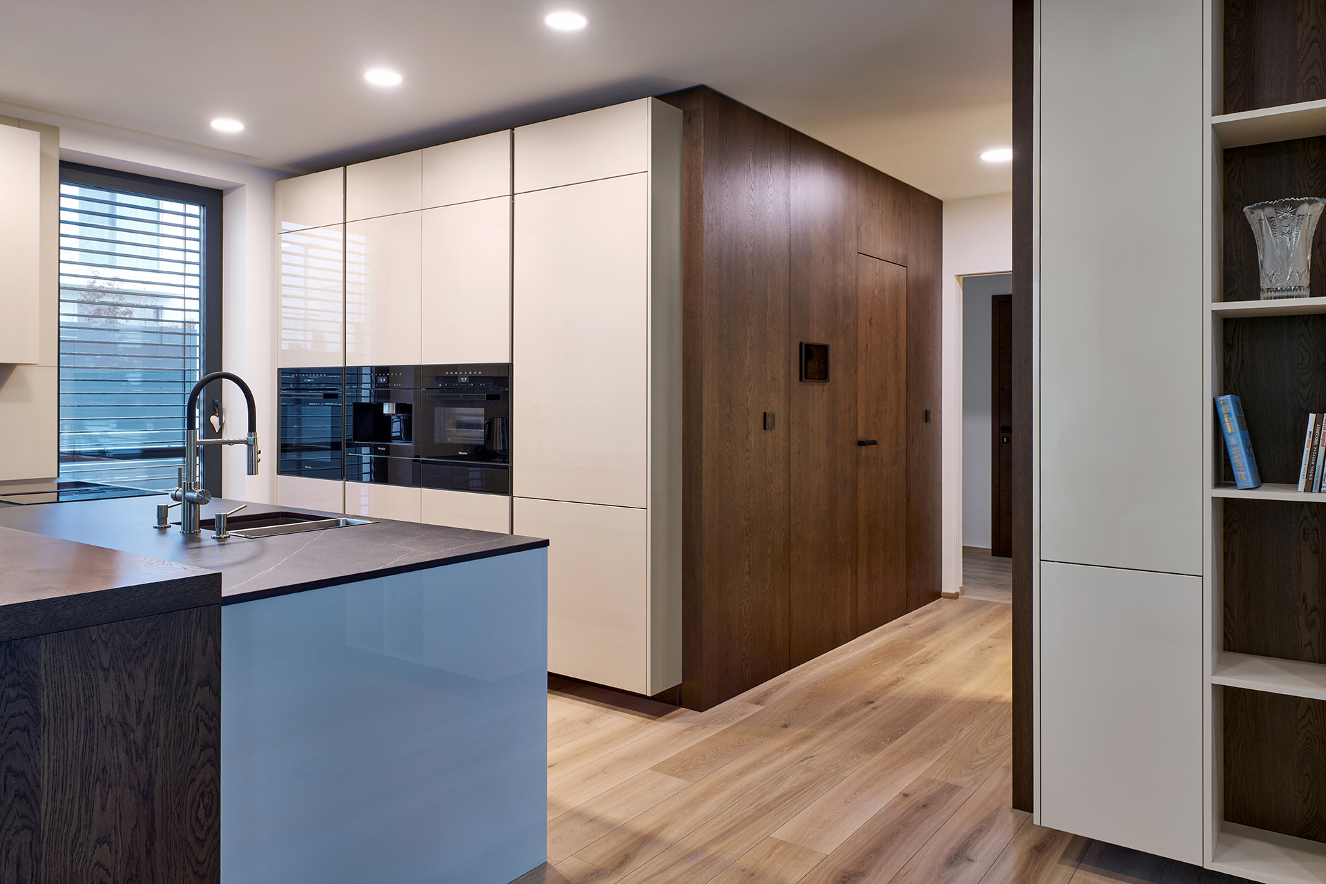 Při návrhu tohoto rodinného domu byla hlavní myšlenkou vizuální návaznost všech částí interiéru v jednotný a harmonický celek. Celým prostorem prostupuje uklidňující paleta v odstínech champagne, kterou přirozeně doplňuje rustikální hnědá dubová dýha. Společně vytvářejí moderní, a přitom hřejivé a příjemné prostředí pro každodenní život.