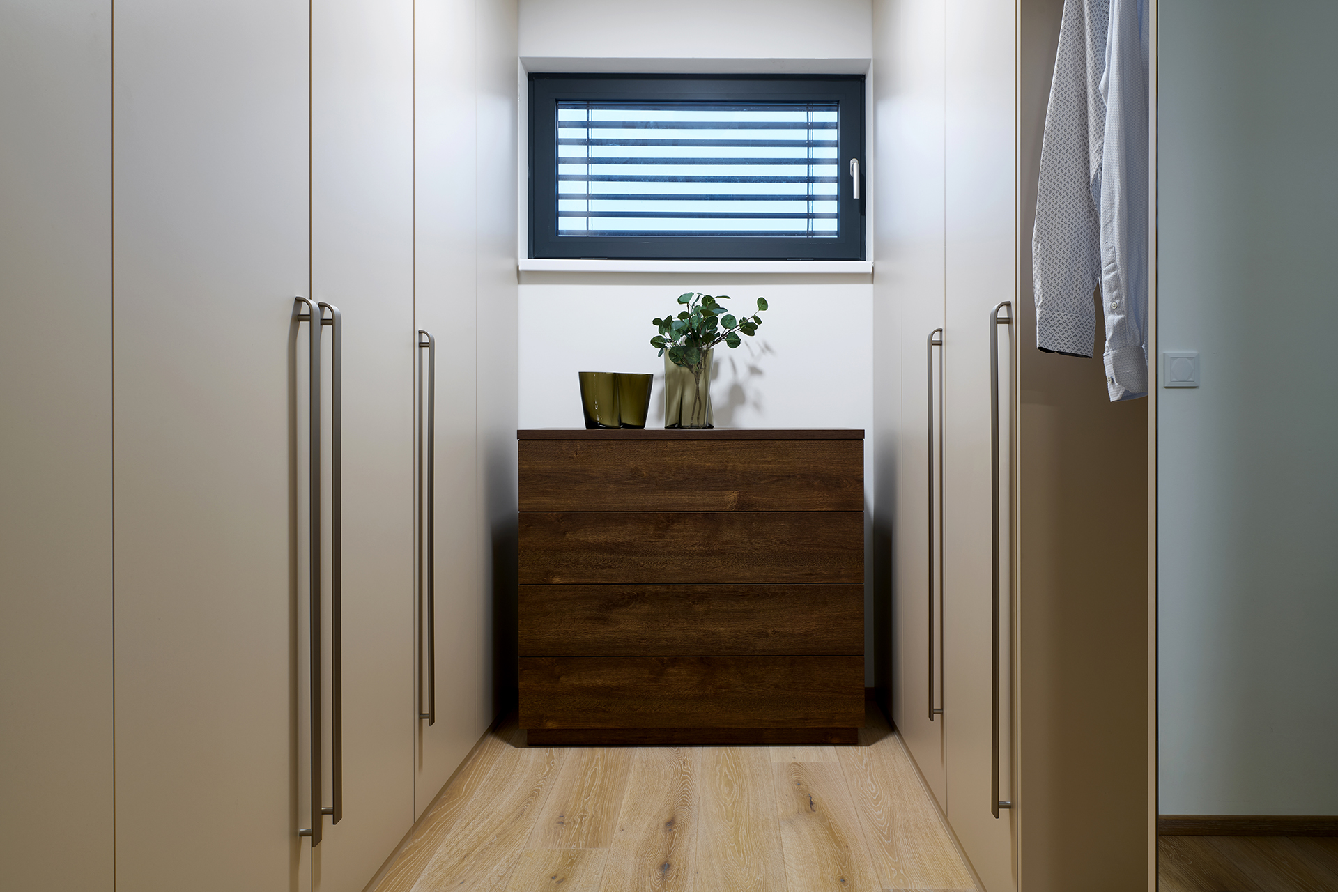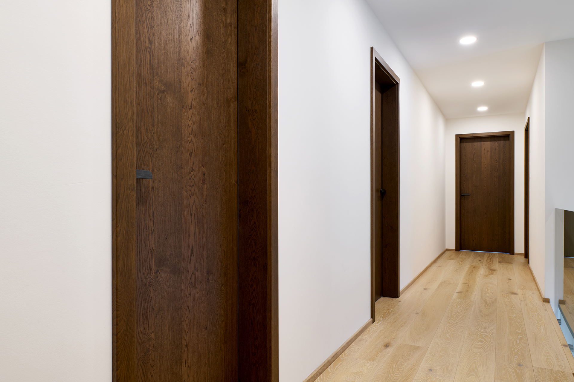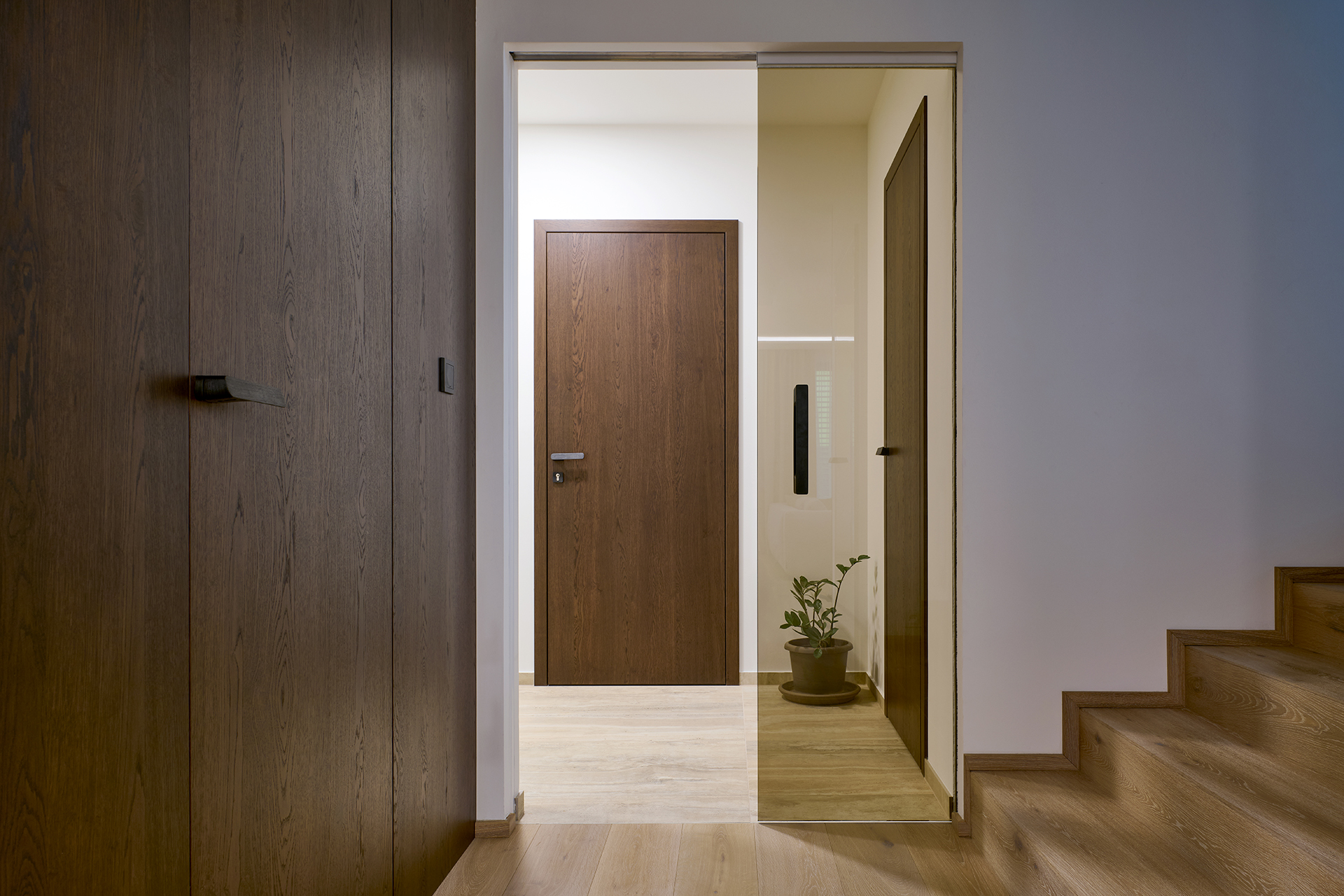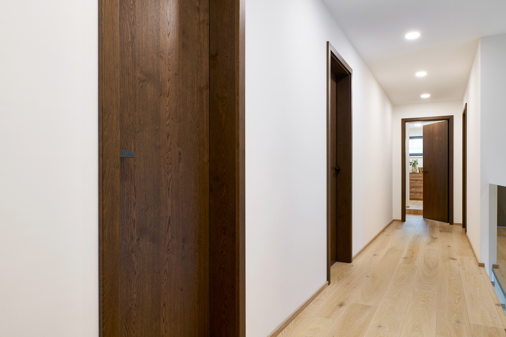 Významnou roli hrají také interiérové dveře. V reprezentativních částech domu byly zvoleny dveře v obkladu SPACE, zatímco ostatní místnosti doplňují varianty MILLENIUM LITE a SPACE LITE. Přechody mezi jednotlivými místnostmi tak působí přirozeně, čistě a nerušeně.
