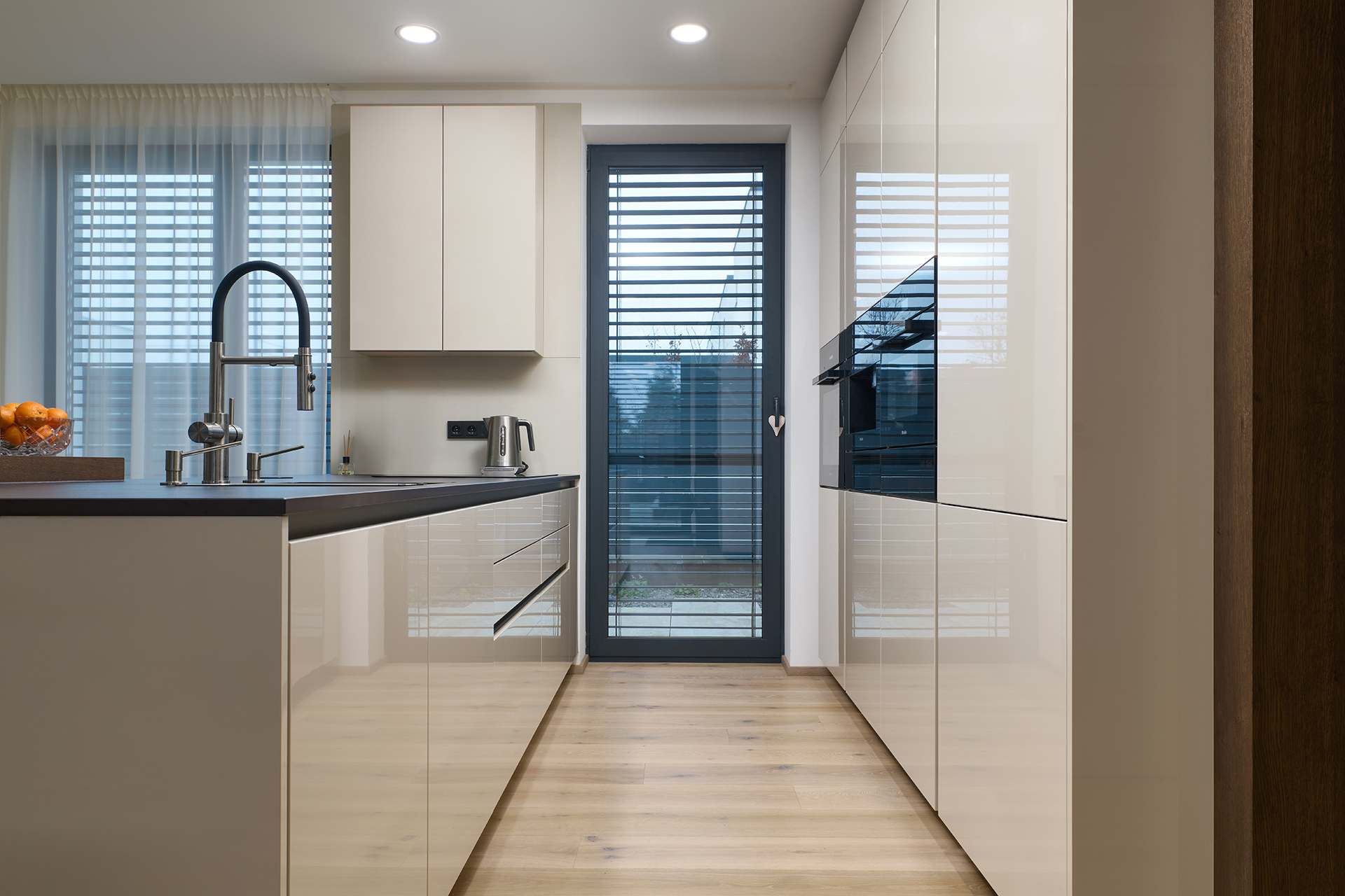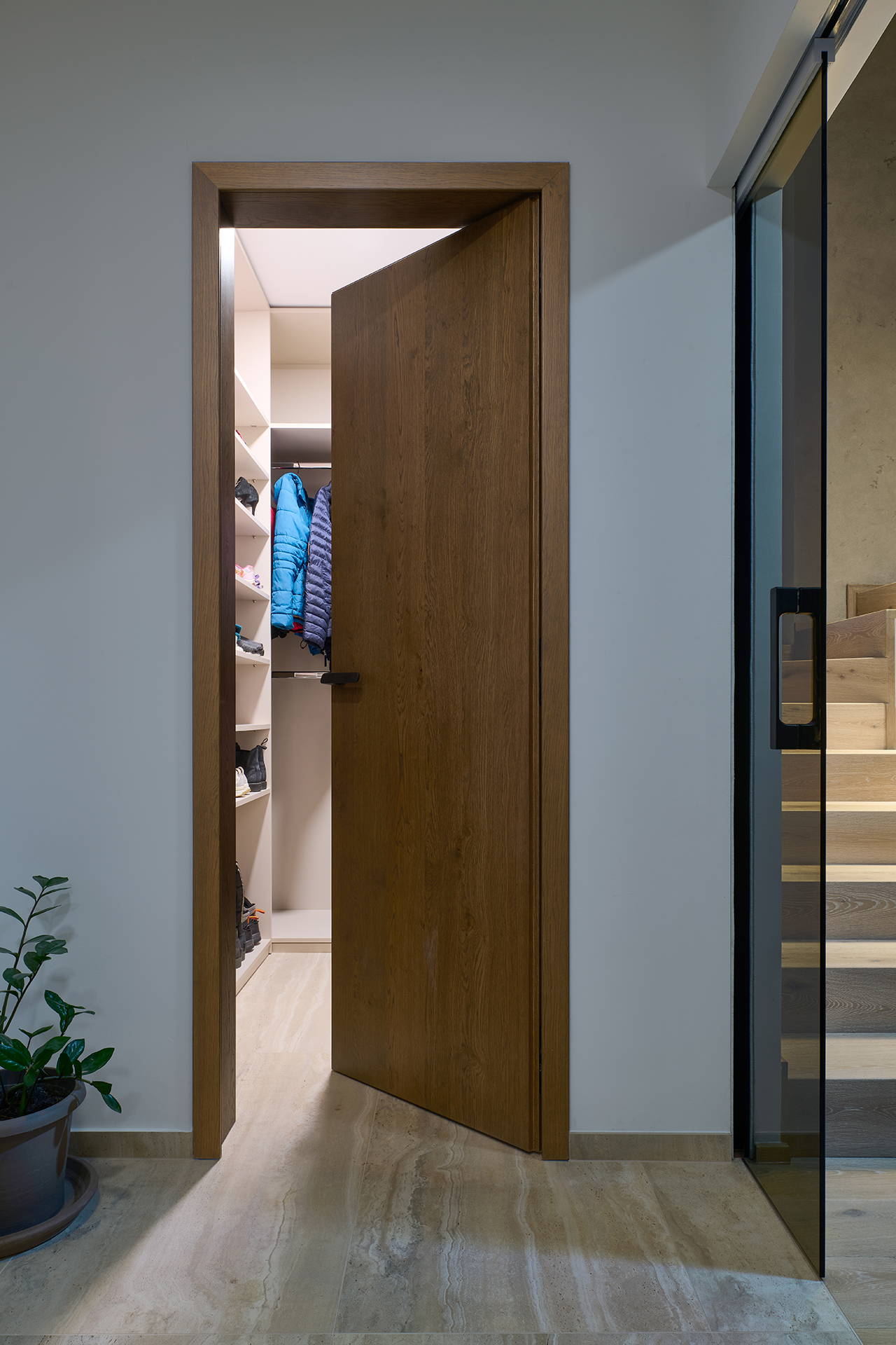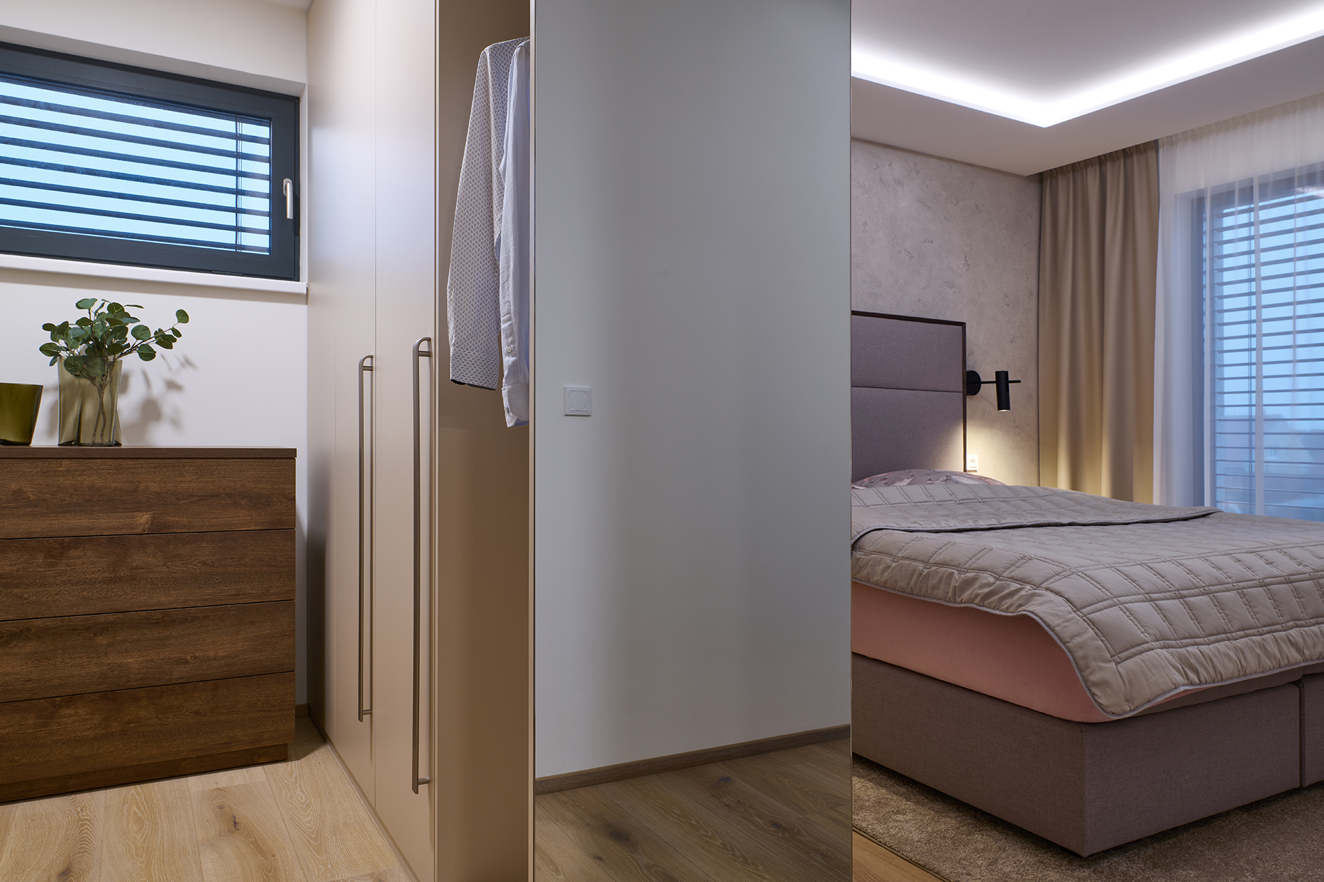 Významnou roli hrají také interiérové dveře. V reprezentativních částech domu byly zvoleny dveře v obkladu SPACE, zatímco ostatní místnosti doplňují varianty MILLENIUM LITE a SPACE LITE. Přechody mezi jednotlivými místnostmi tak působí přirozeně, čistě a nerušeně.