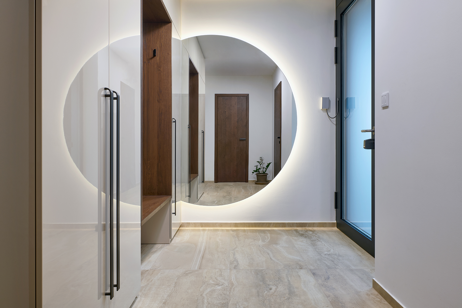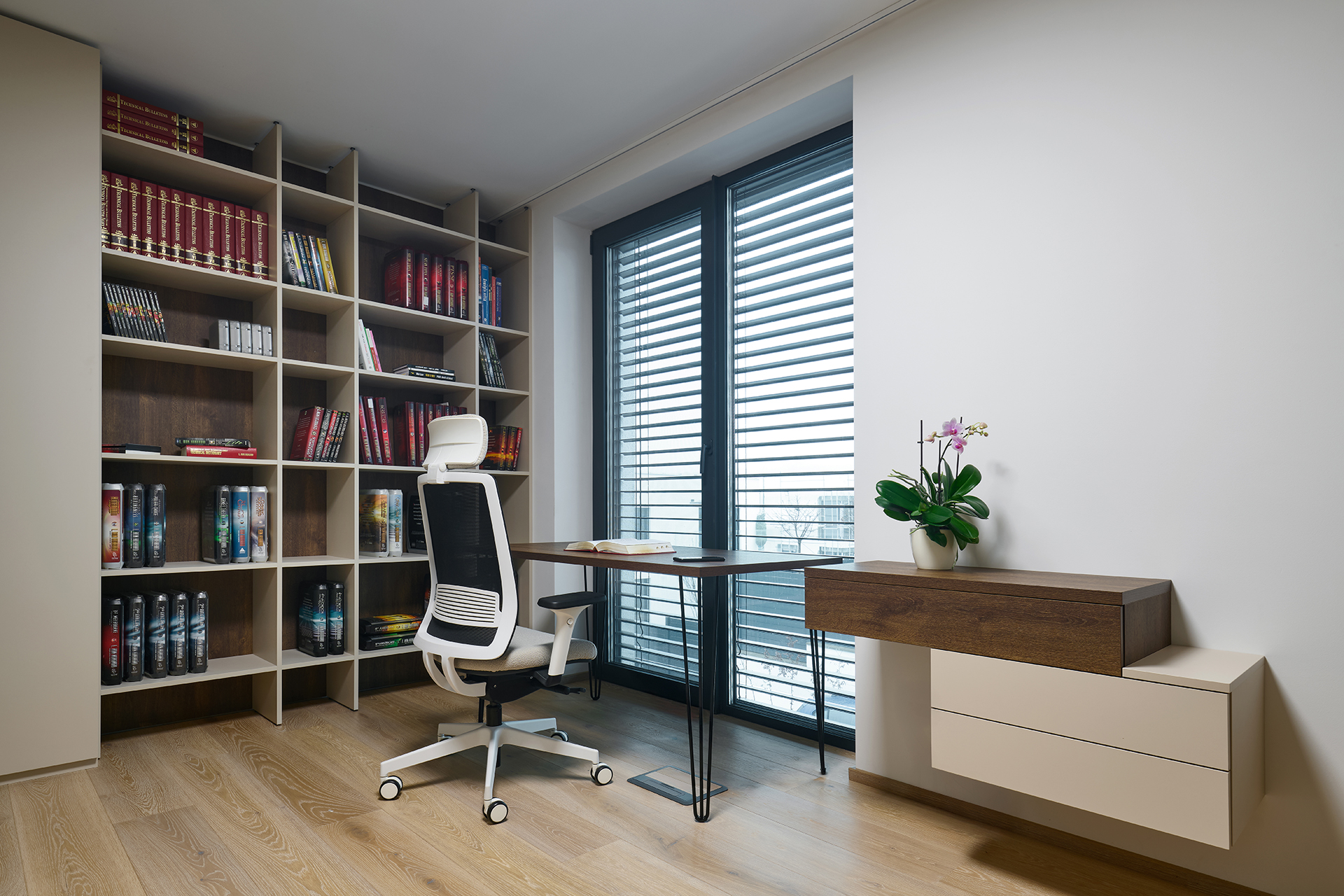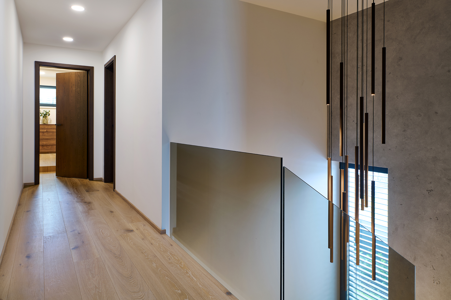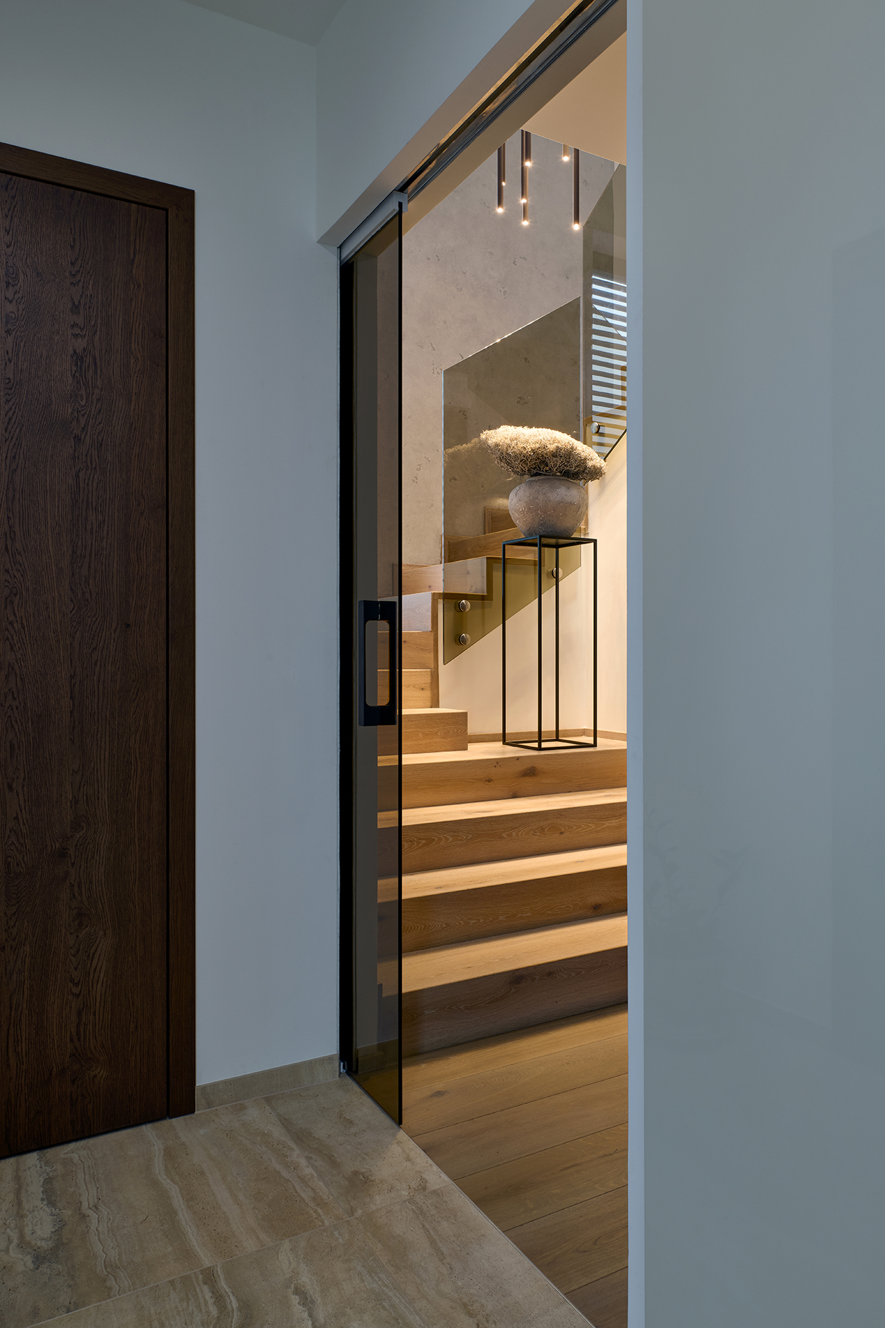 Významnou roli hrají také interiérové dveře. V reprezentativních částech domu byly zvoleny dveře v obkladu SPACE, zatímco ostatní místnosti doplňují varianty MILLENIUM LITE a SPACE LITE. Přechody mezi jednotlivými místnostmi tak působí přirozeně, čistě a nerušeně.