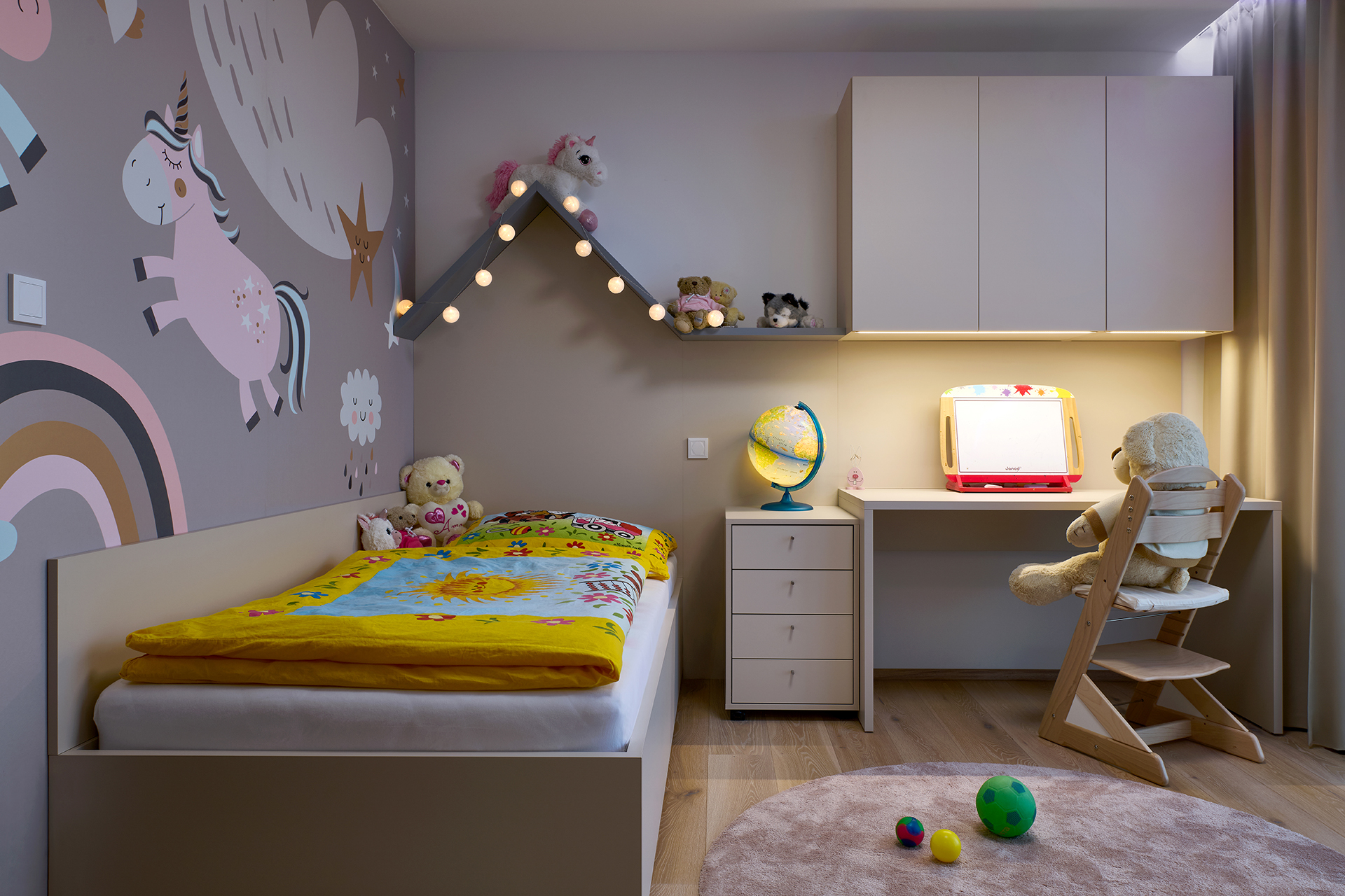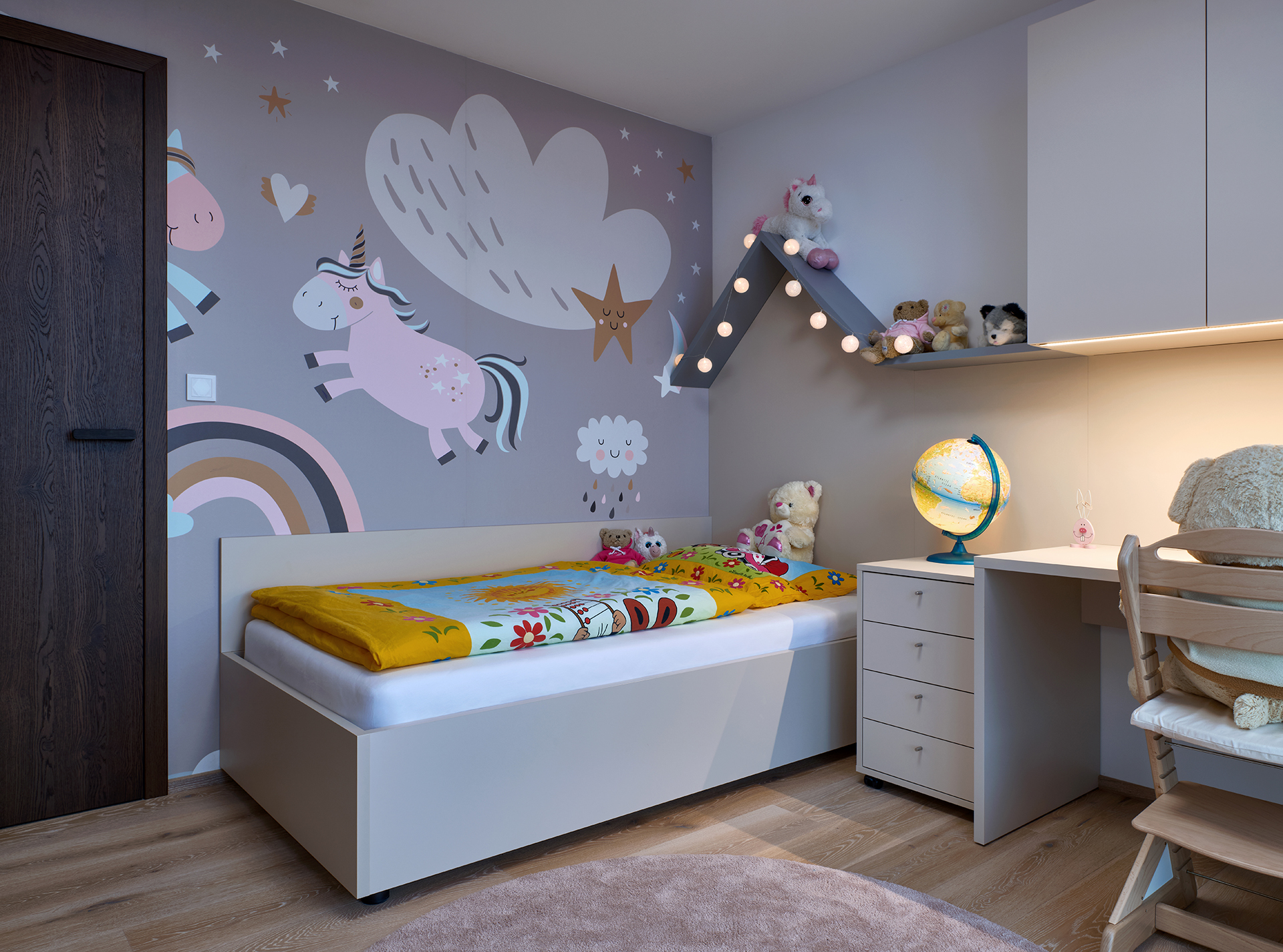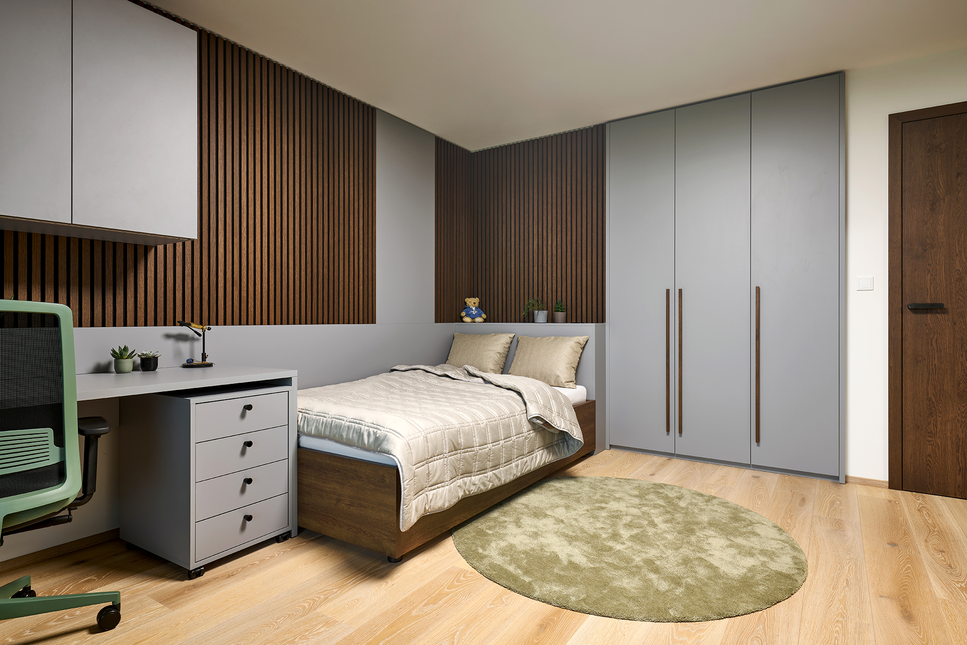 Dětské pokoje respektují jednotnou linii prostřednictvím světlých lamin v kombinaci s přírodními dekory. Integrované LED osvětlení nad pracovními plochami zajišťuje pohodlné a příjemné prostředí pro studium i volný čas.