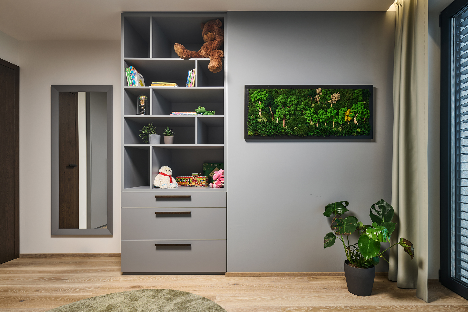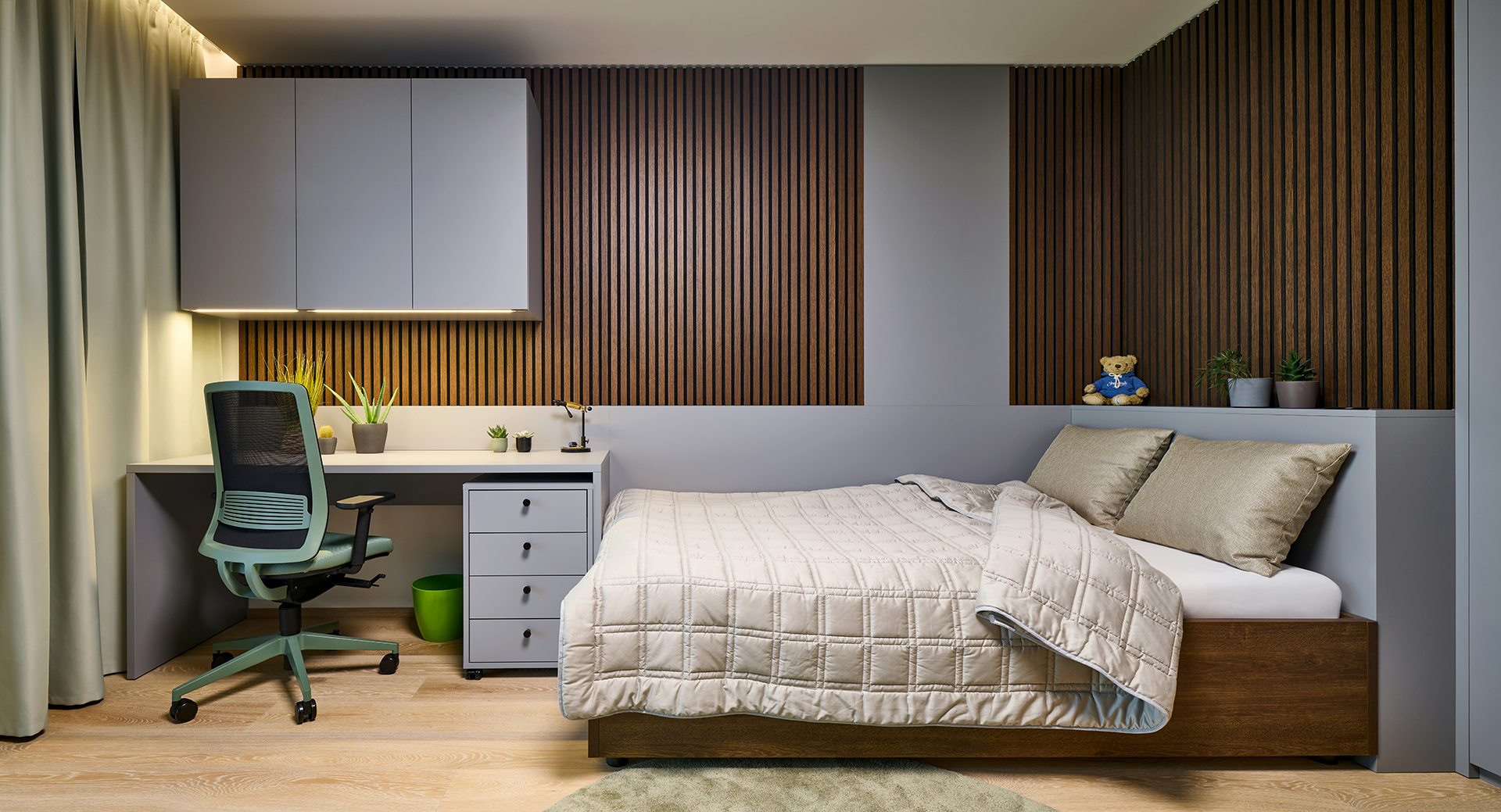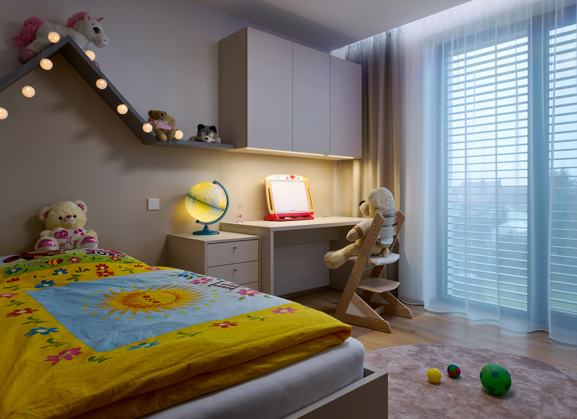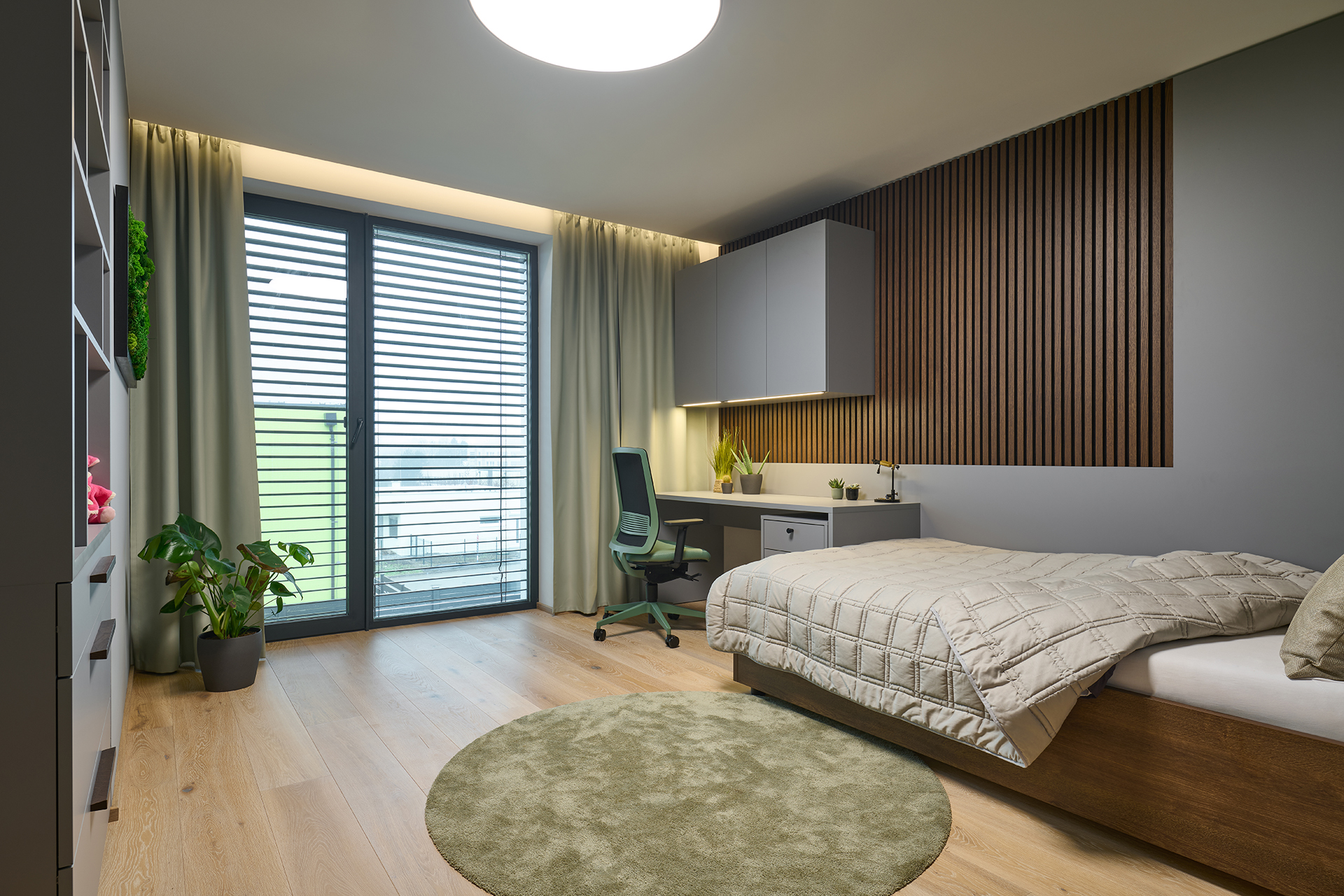 Dětské pokoje respektují jednotnou linii prostřednictvím světlých lamin v kombinaci s přírodními dekory. Integrované LED osvětlení nad pracovními plochami zajišťuje pohodlné a příjemné prostředí pro studium i volný čas.