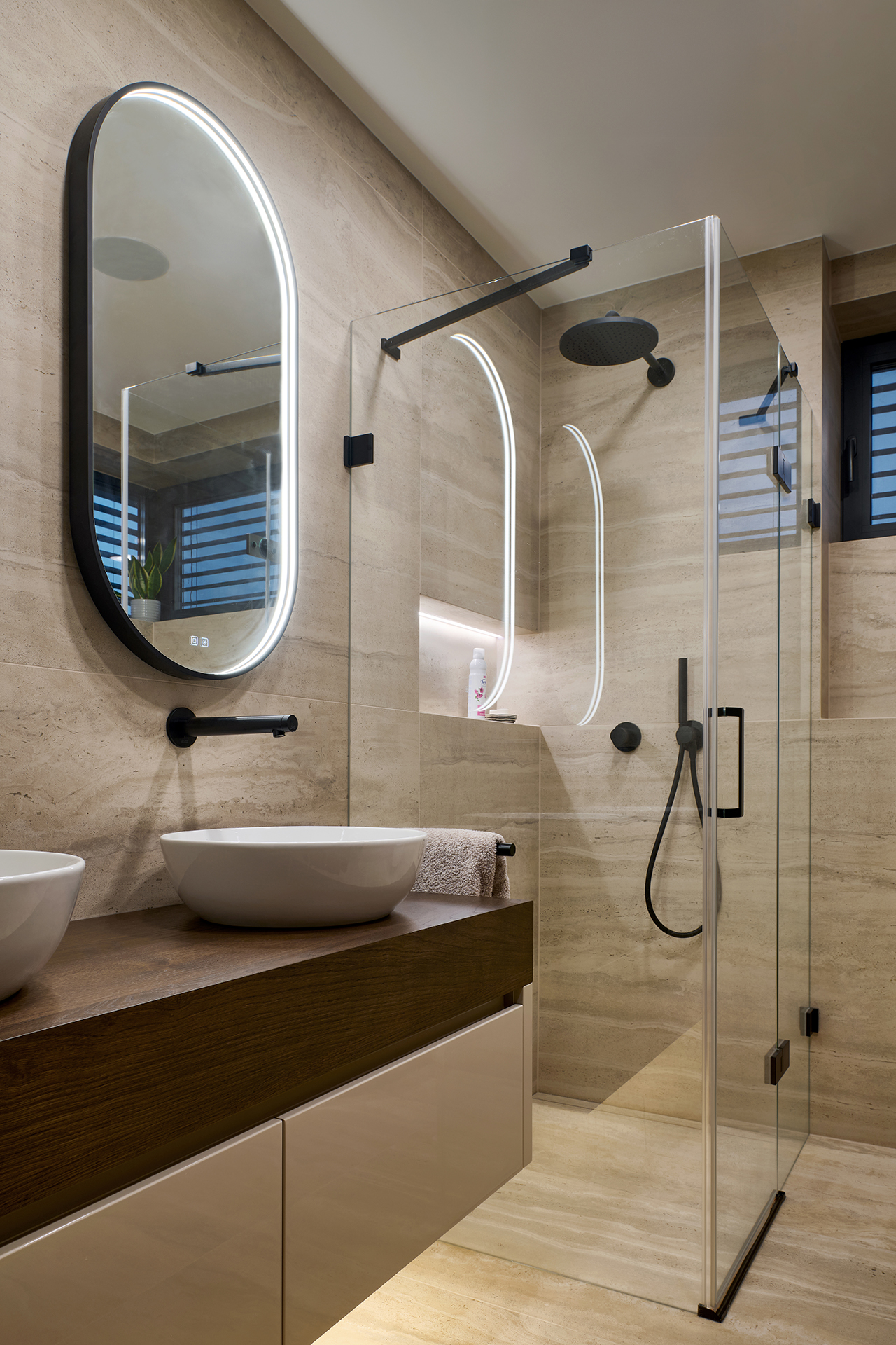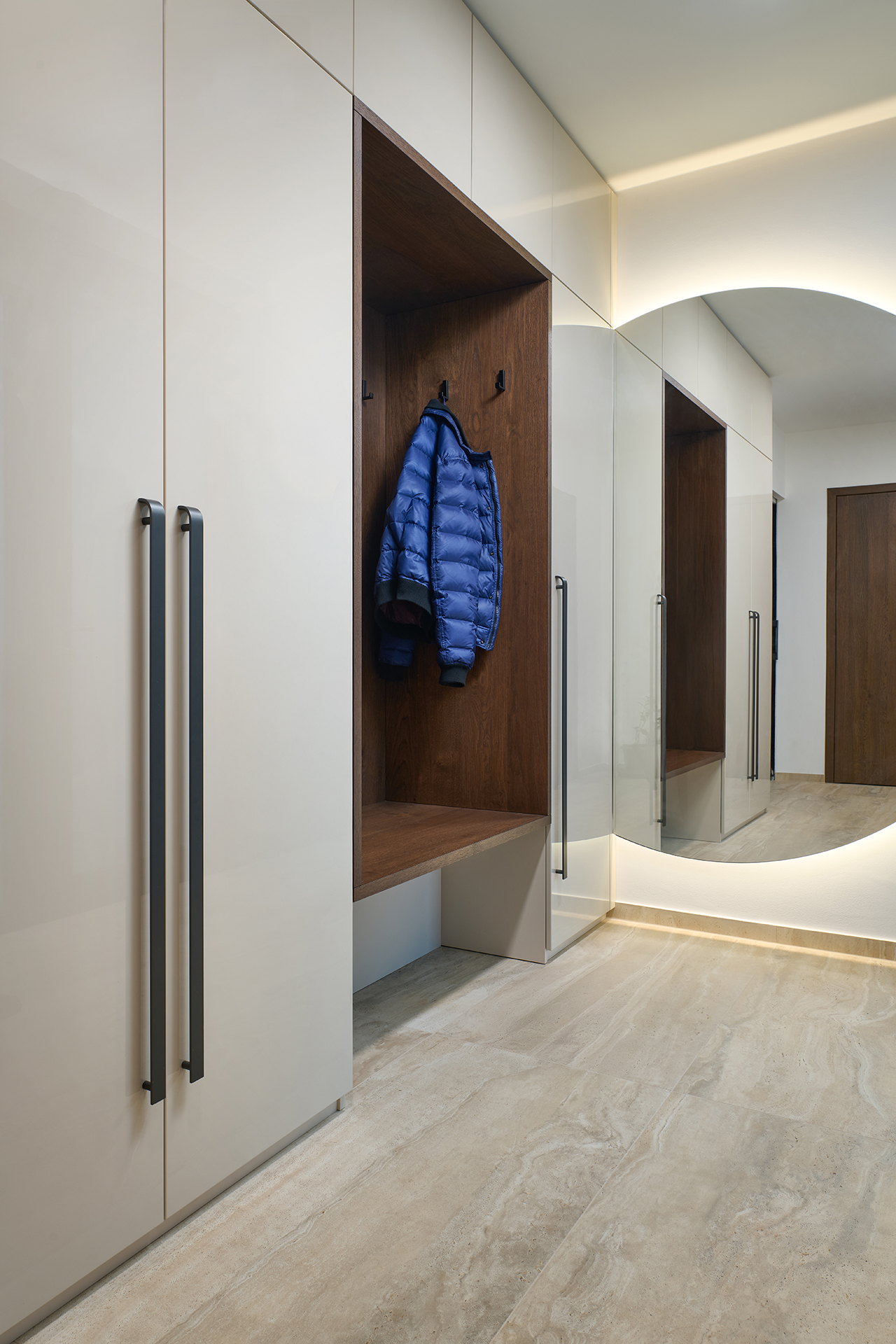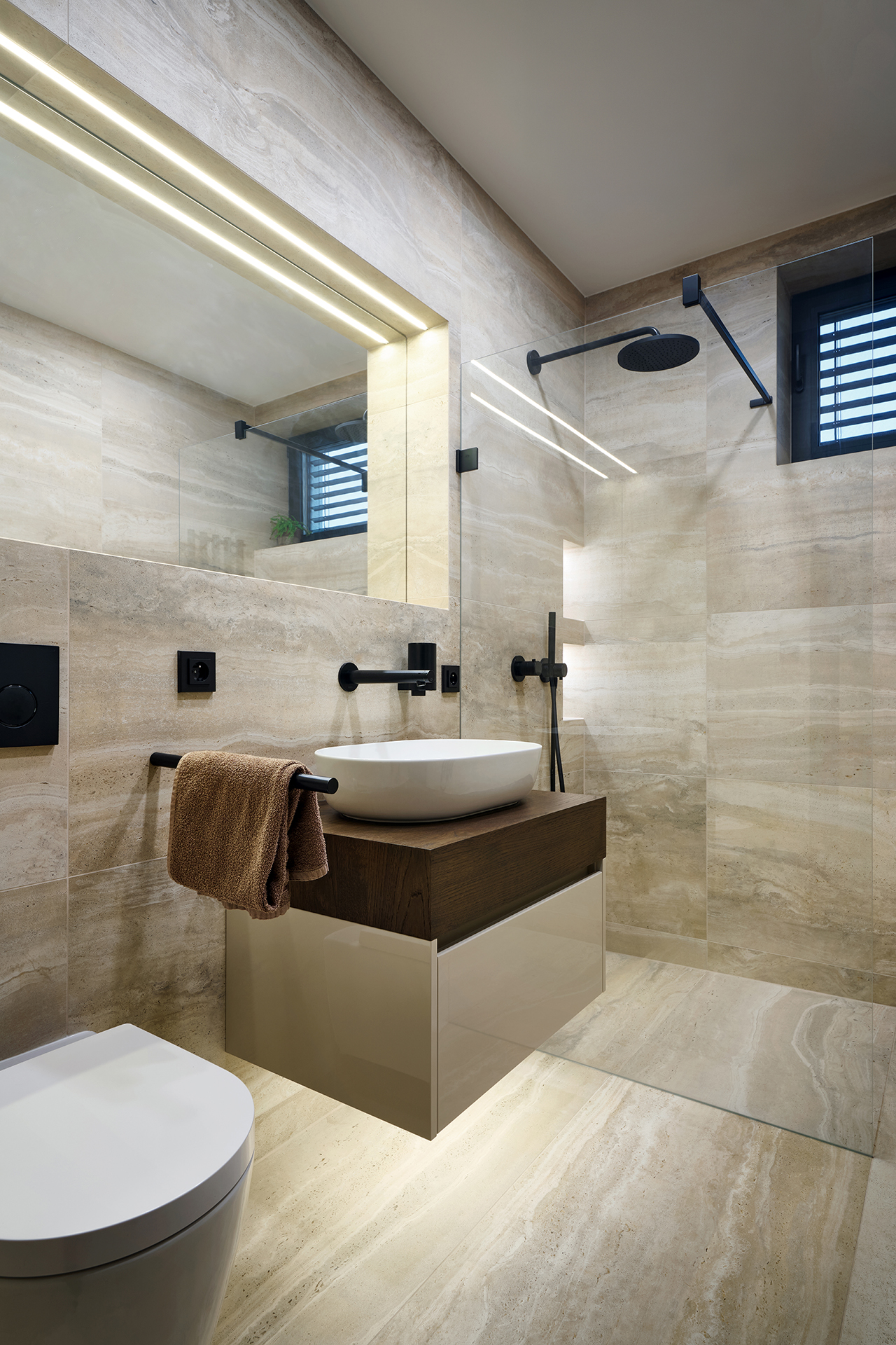 Koupelny celý koncept uzavírají harmonickým spojením lesklých ploch a dubových desek pod umyvadly. Precizní zpracování úložných systémů i důmyslně řešené otevírací profily potvrzují důraz na detail, funkčnost a vysokou kvalitu zpracování.